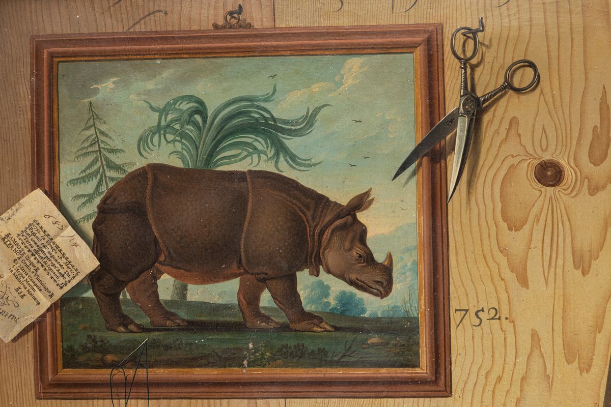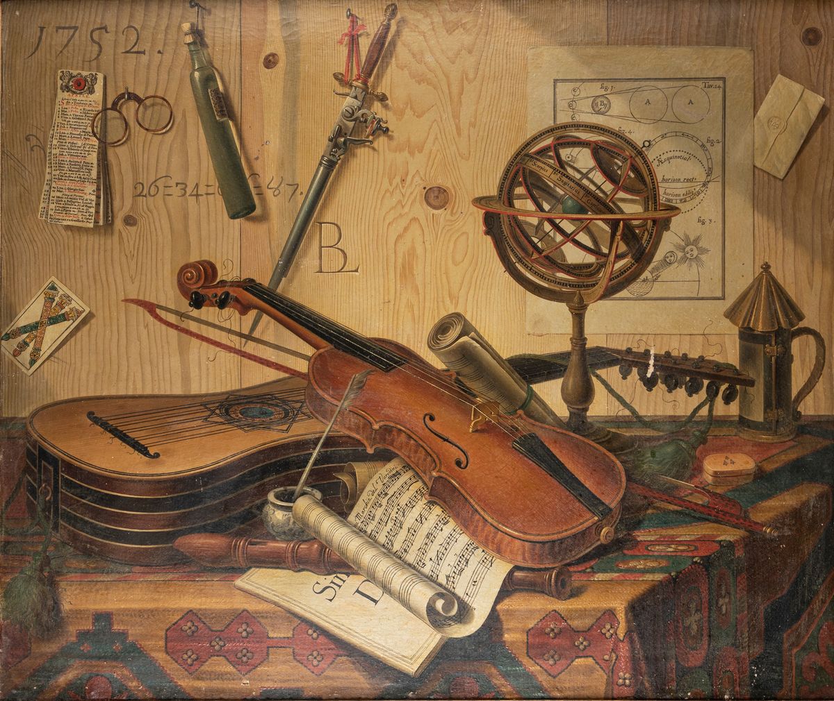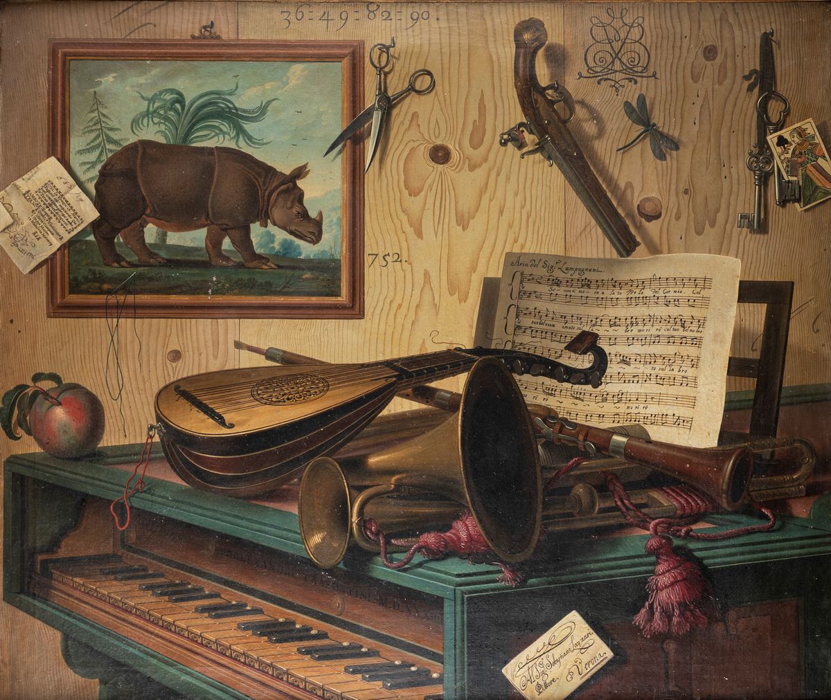 Nei due dipinti in esame campeggiano al centro vari strumenti musicali: nel primo, un mandolino, un trombone, un clavicembalo e un oboe e, nel secondo, un violino con archetto, una chitarra e un flauto, affiancati da una sfera armillare. Nel primo quadro sono anche presenti precisi riferimenti a personaggi del mondo della musica; compaiono, infatti, sul clavicembalo, il nome di Alessandro Trasontini - costruttore di organi e di strumenti da tasto attivo a Venezia nel secolo XVI - e, sullo spartito, quello di Giovanni Battista Lampugnani, compositore milanese attivo anche a Venezia nel secolo XVIII. Sulle pareti di legno di entrambi i dipinti si distribuiscono in modo casuale gli oggetti più curiosi (una ricevuta del gioco del lotto, chiavi, carte, forbici, un quadro, armi, un calendario mensile, il foglio di un libro di astronomia, una busta, degli occhiali), intrecciati con alcune sequenze numeriche, come se l'artista volesse rimandare a un significato nascosto, se non ludico.