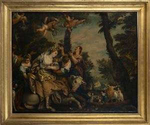 The painting replays in a reduced format the famous prototype by Paolo Veronese in Venice, Palazzo Ducale.