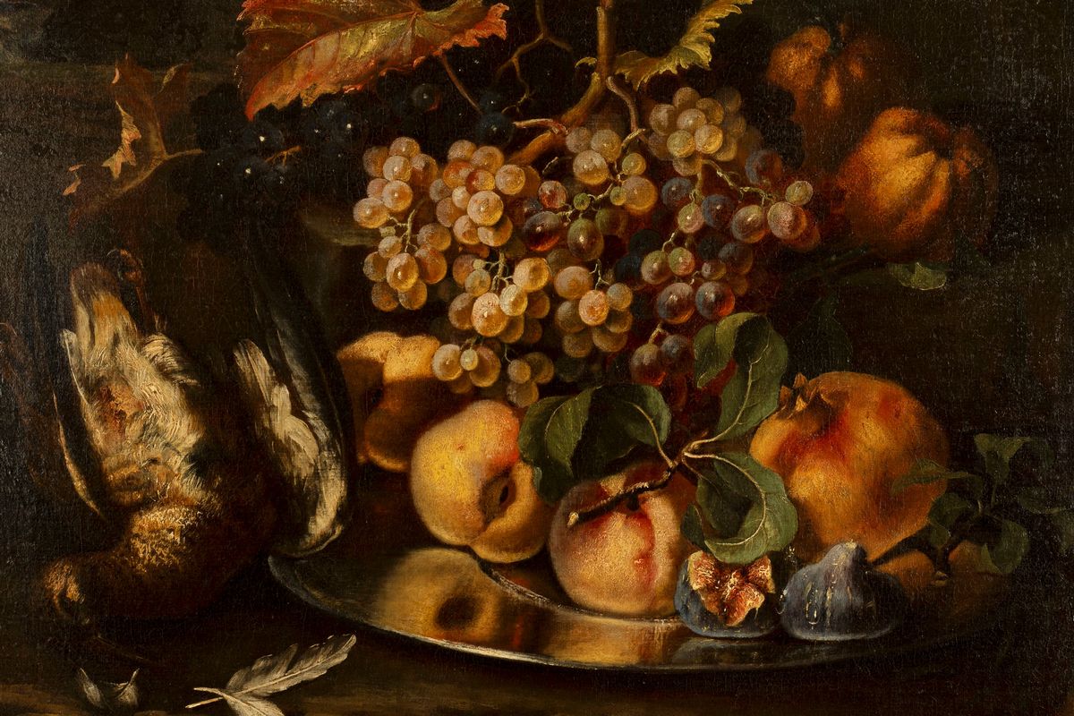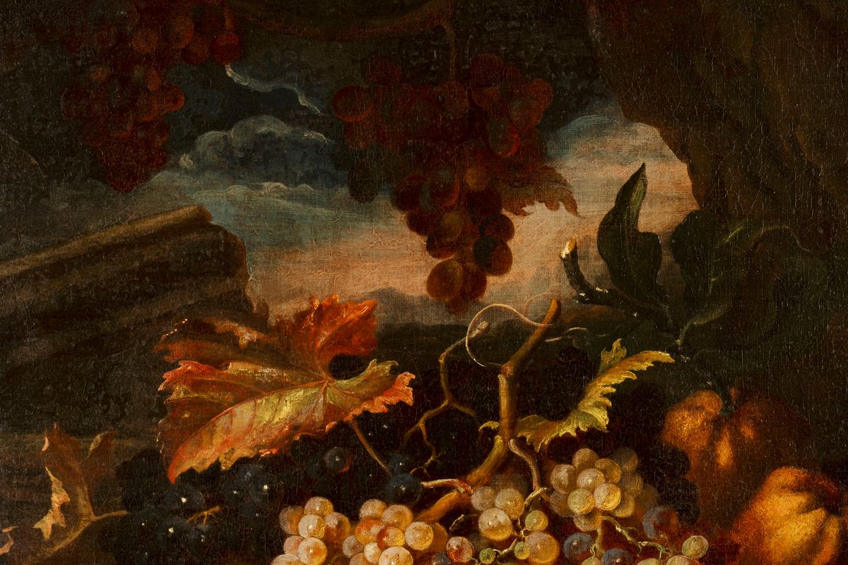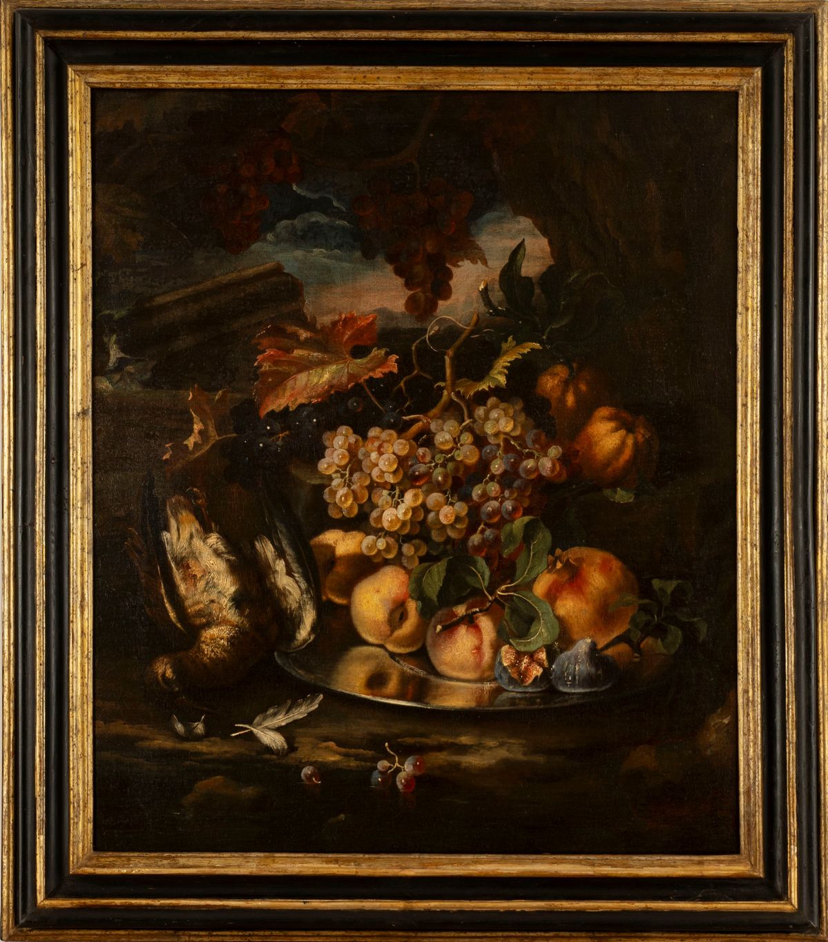 Still life of fruit on a silver platter, bird and architectural fragments within a landscape
