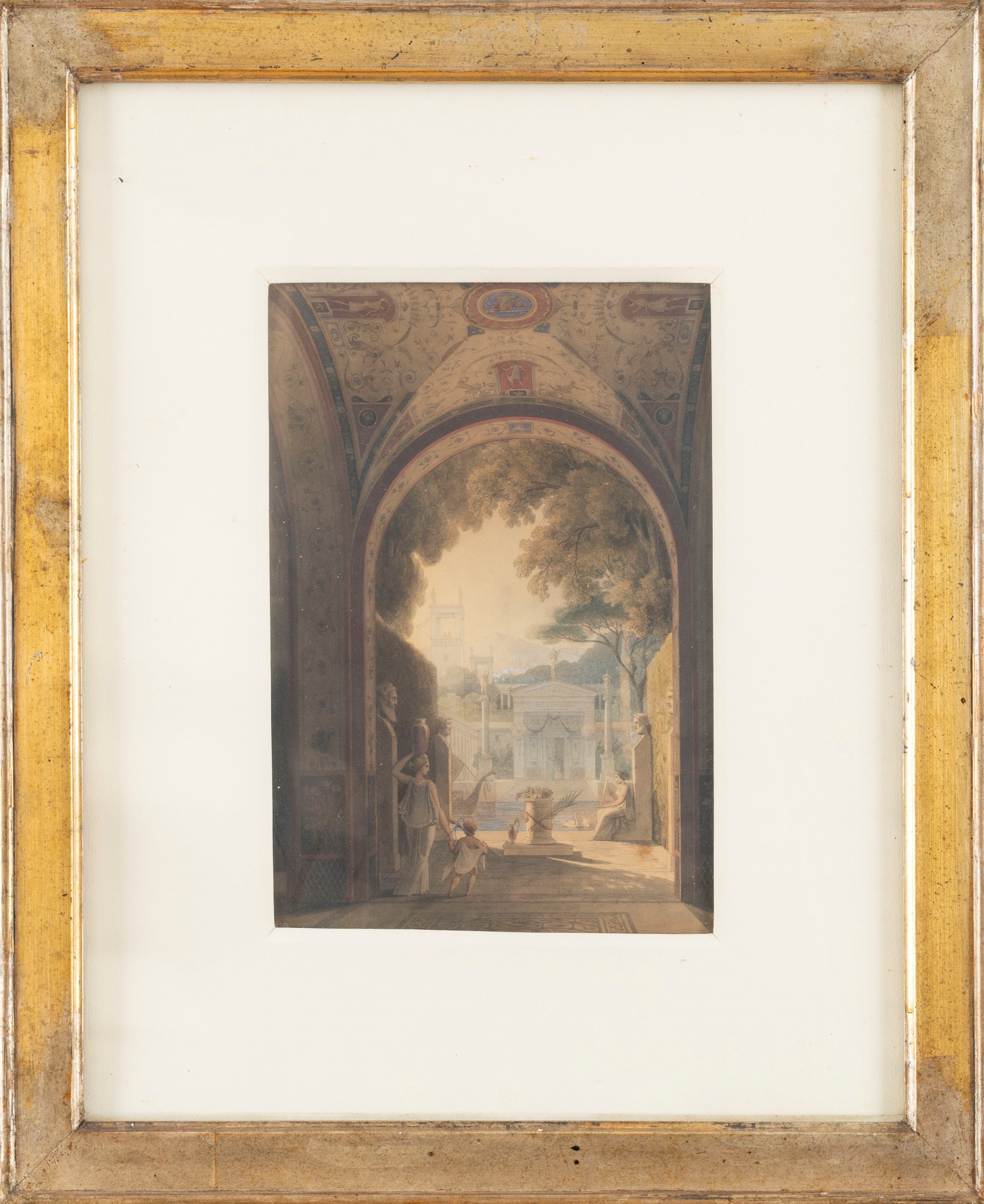 L'ideazione di grande effetto compositivo riflette la febbre archeologica che animava gli ambienti accademici europei della prima metà dell'Ottocento, di cui Bouchet fu felice interprete. Accanto all'attenzione filologica per la scoperta dei monumenti, a cui appartiene il lavoro dedicato alla villa pompeiana del poeta tragico, Bouchet non manca di elaborare delle mise-en-scène d'invenzione d'interni, qui arricchita dalle prove colore dell'artista presenti ai margini del foglio.