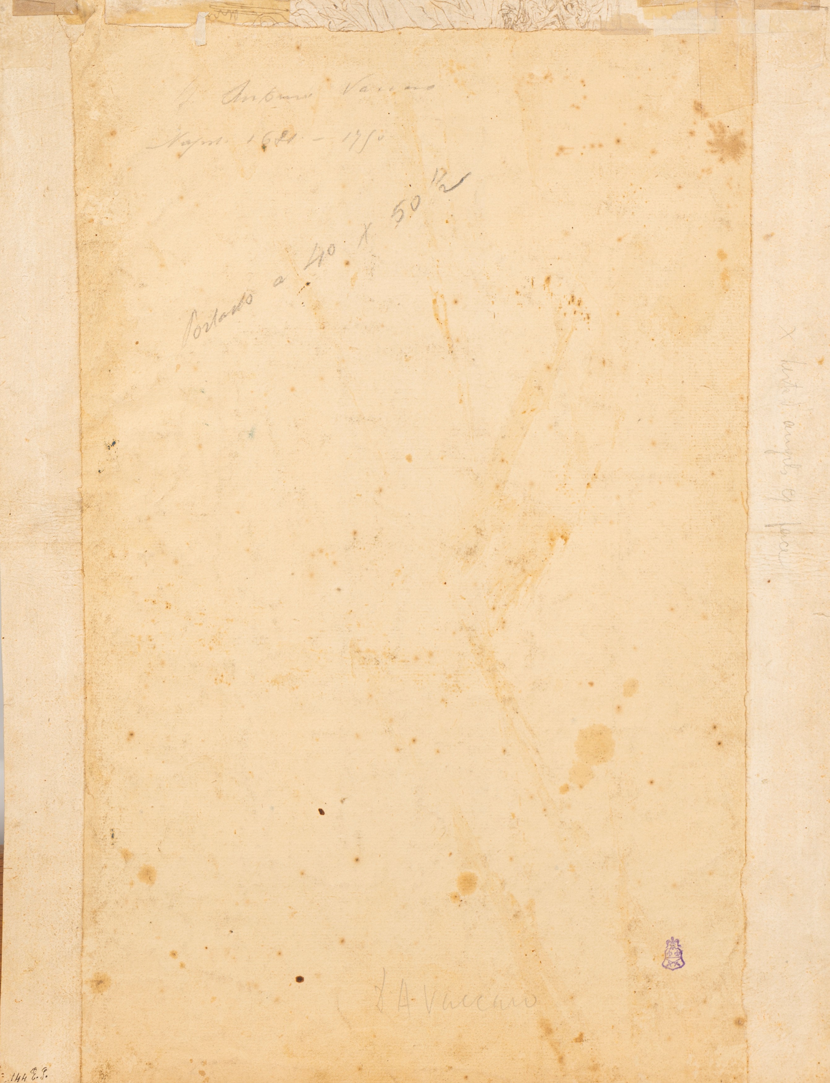 The original allegorical invention celebrates, in the upper part, the Church (or Religion) that mirrors itself in the Truth, while at the bottom there are five chained figures, which allude to the infidels, to whom a soldier with a torch in his hand shows the Truth. We point out a painting on copper by Vaccaro, at the Walters Art Museum in Baltimore (Maryland, USA), similar in composition to the drawing offered in the lot but larger in format and more refined in details.