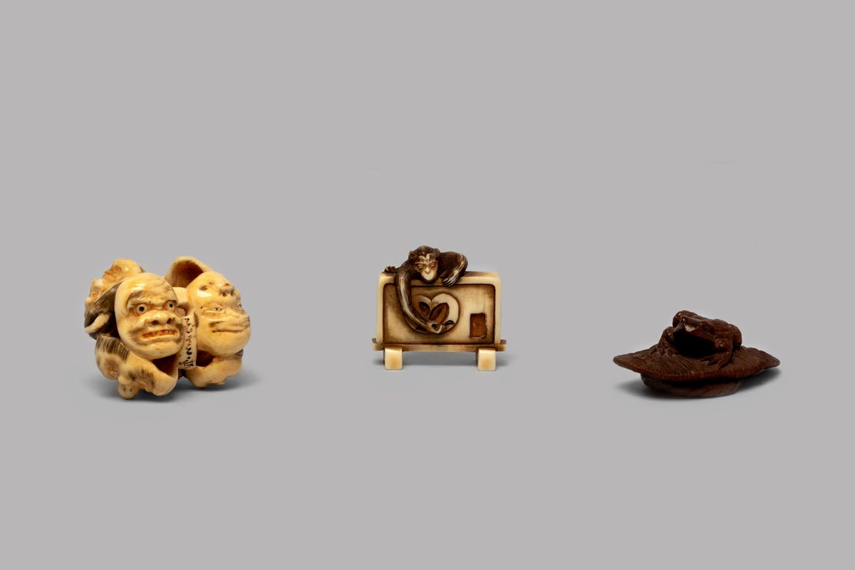 An ivory netzuke depicting 7 heads; An ivory netzuke depicting a monkey on a screen and a wooden okimono in the shape of a sandal with a frog, signed