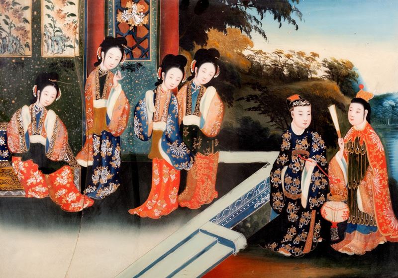 Two paintings on silk, depicting a landscape with fishermen and a procession with a white elephant,...