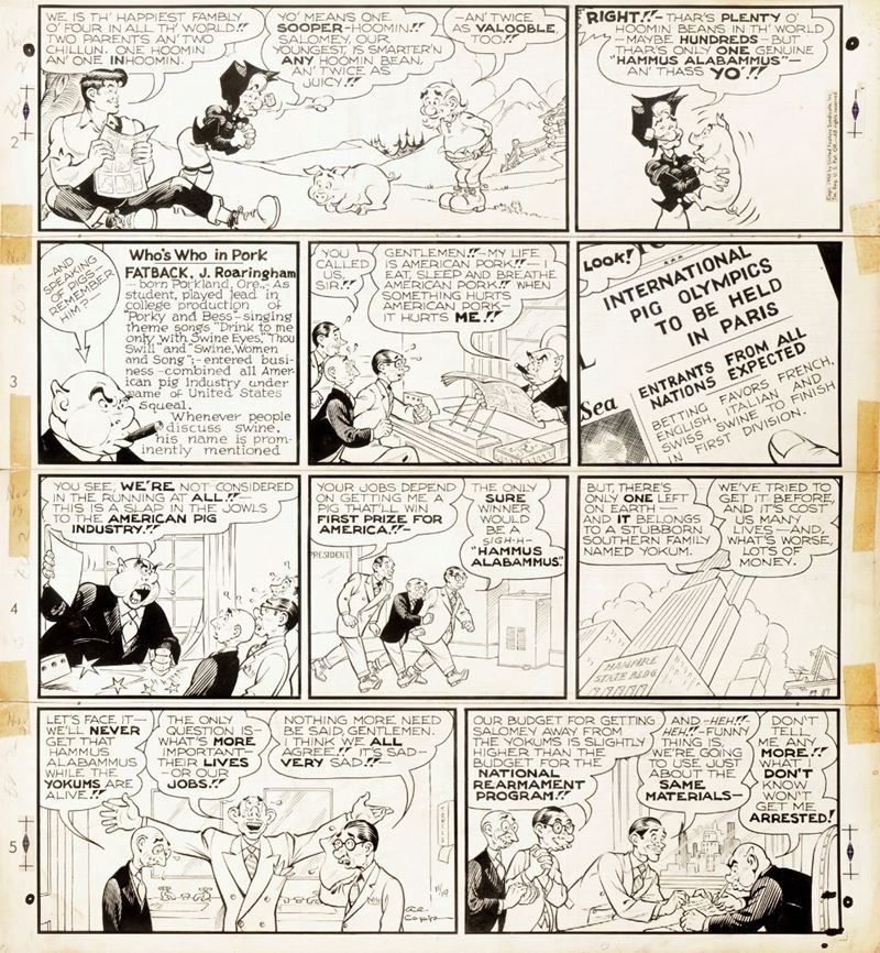 matita e china su cartoncino 53 x 57 cm Pencil and ink on thin cardboard. Sunday strip from the 19/11/1950 for “Li’l Abner”. On four panels. Signed and dated.