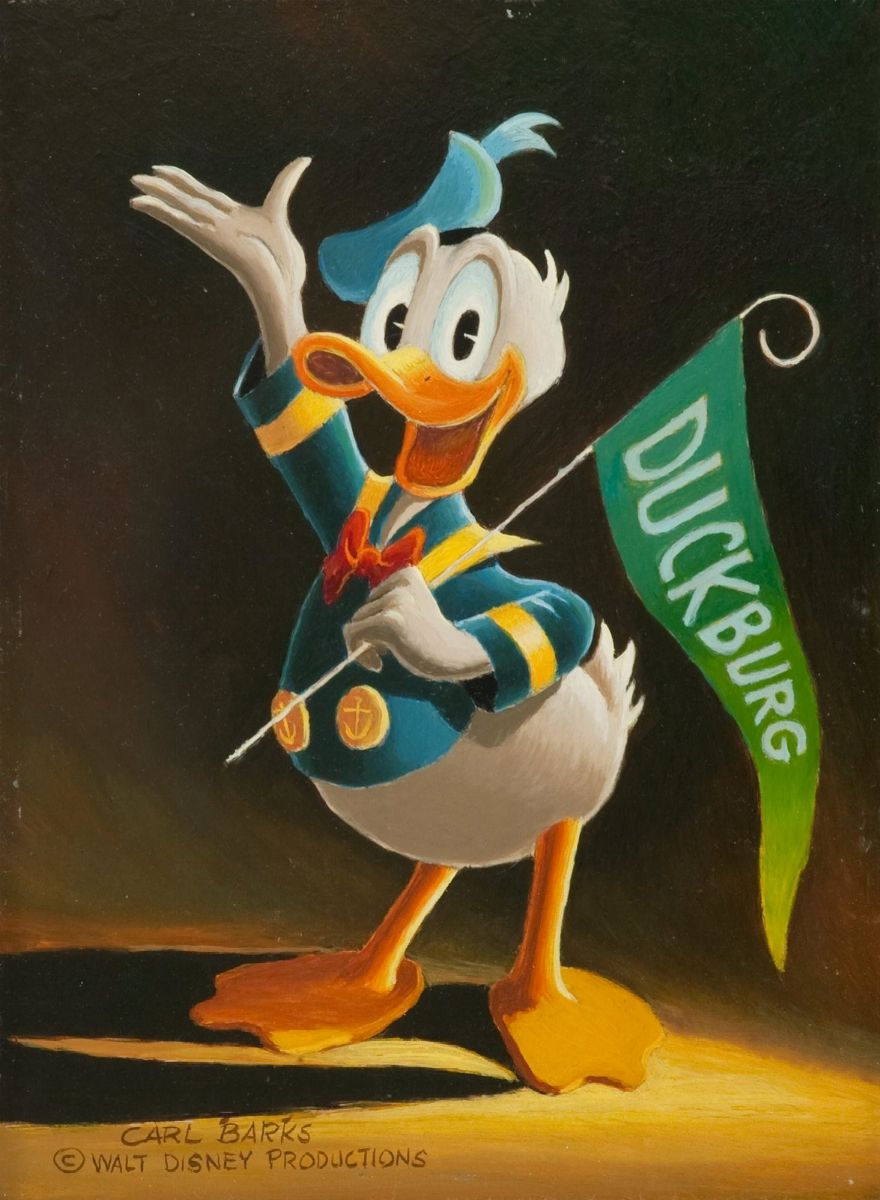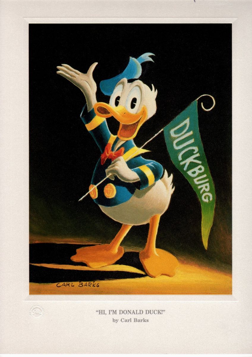 Pencil and pastel on paper. Preliminary drawing done by Barks in 1975 for the famous oil painting entitled “Hi, I’m Donald Duck”, an authentic family portrait that Barks wanted to give his fans. We enclose the printing proof of the lithograph based on thi