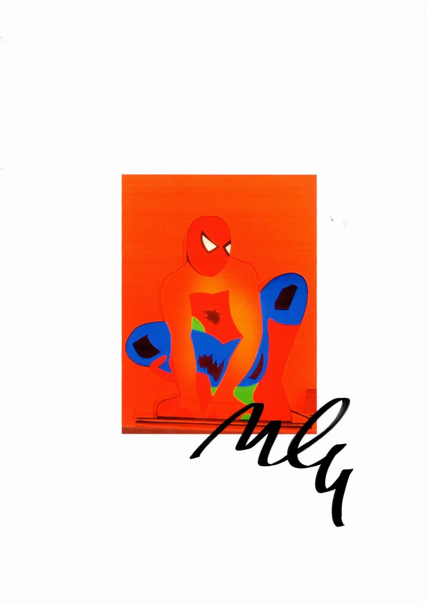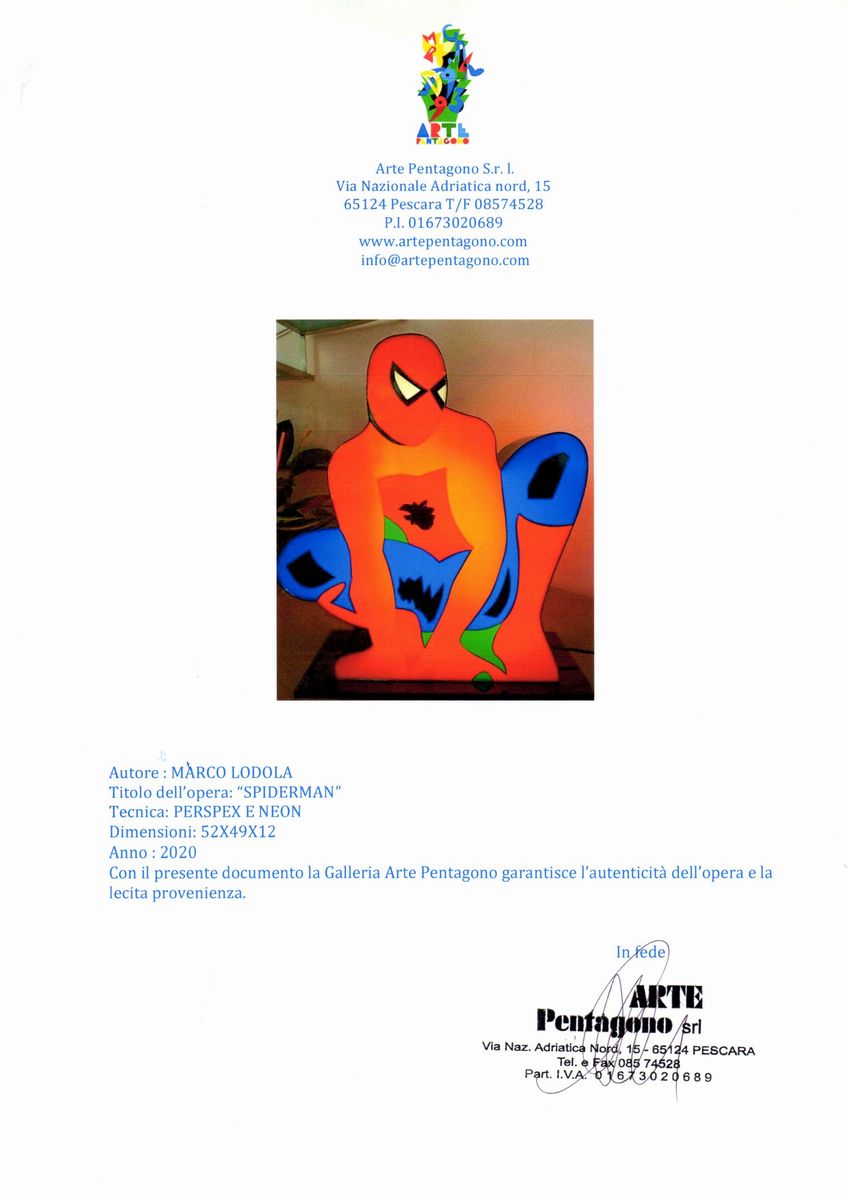 Perspex and neon. Light sculpture by the master Lodola, made of perspex and neon, part of his cycle dedicated to Superheroes. We enclose the certificate of authenticity of the gallery of origin and a photo of the sculpture signed by the artist. Signed at