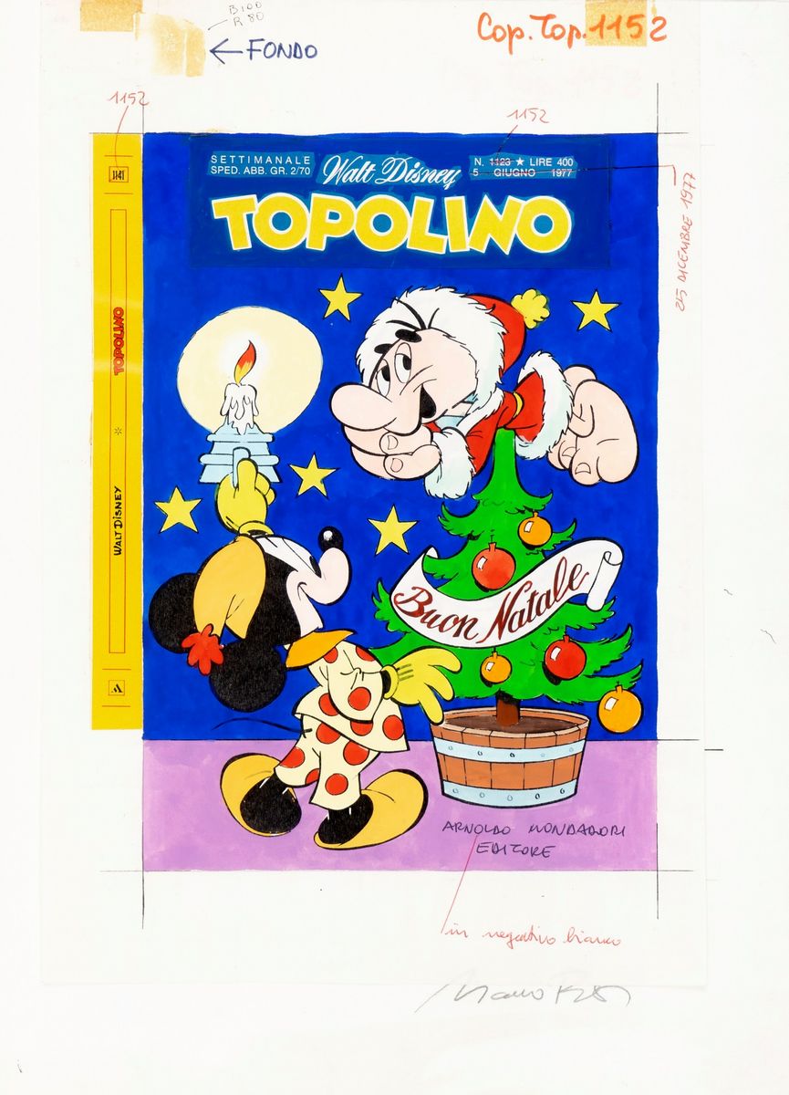 Pencil and ink on thin cardboard. Original cover done by Rota for Topolino n. 1152 published in December 1977. We enclose the tempera on photocopy colour proof. Slight crease on the lower margin.