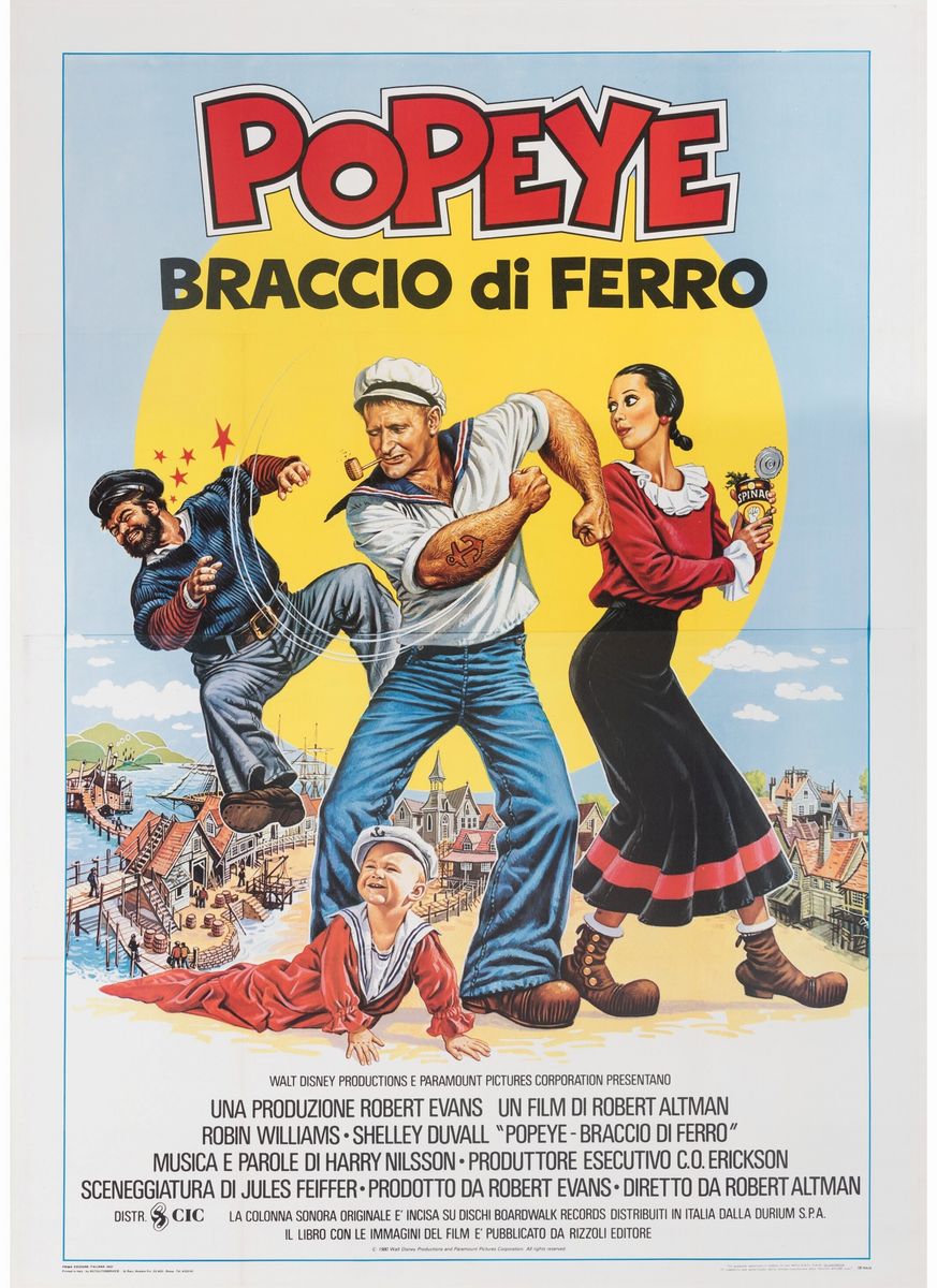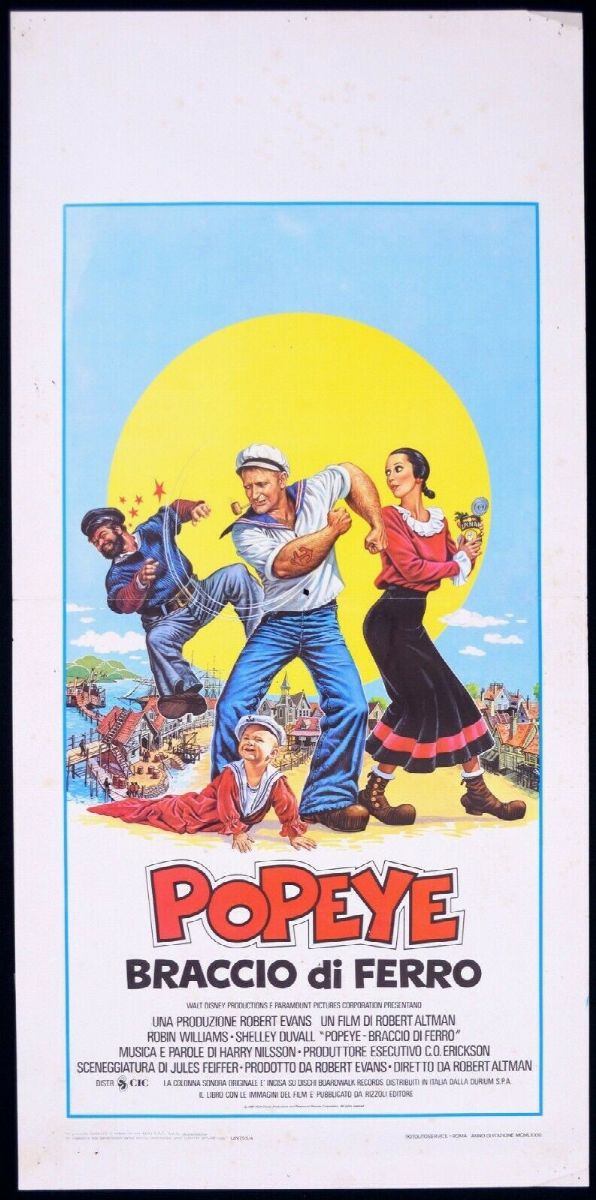 Original painting made by Napoli for the Italian version of the official movie poster of the film "Popeye: Braccio di Ferro", live action based on the famous comic book character made by EC Segar, directed by Robert Altman with Robin Williams in his first role as protagonist together with Shelley Duvall, co-produced by Walt Disney Pictures in 1980.