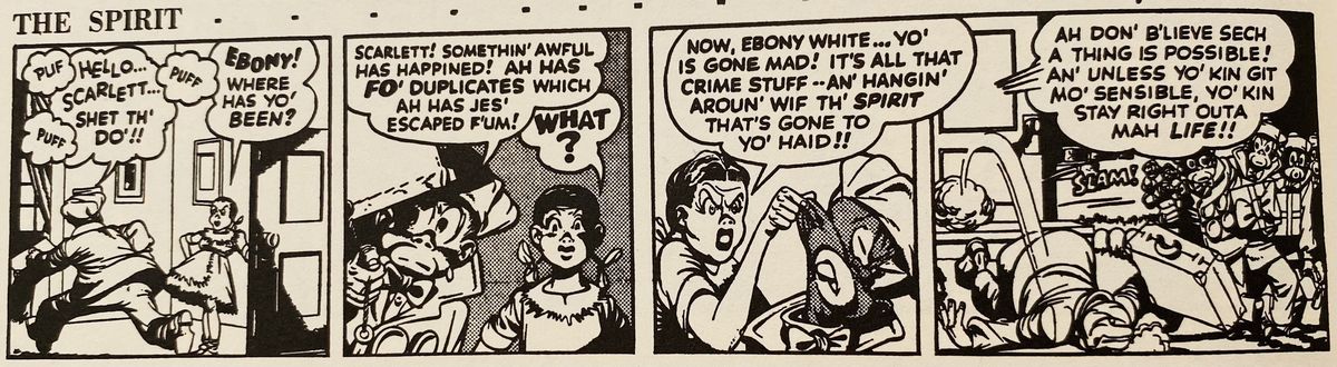 Preliminary drawing for the daily strip of 31/03/1943 for "The Spirit". During the years of the Second World War from 1942 to 1945 Eisner took up service in the United States Army and thus had to abandon his drawing board, the strips of The Spirit were entrusted to ghost artists who continued the work in his absence. The one we have presented is a very rare testimony of how Eisner did not abandon his work even at the front, periodically sending definitive layouts of rare beauty to his overseas collaborators. Some vertical folds and small holes in the left margin. Signed.