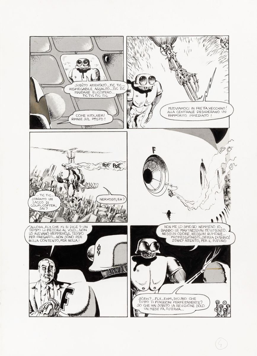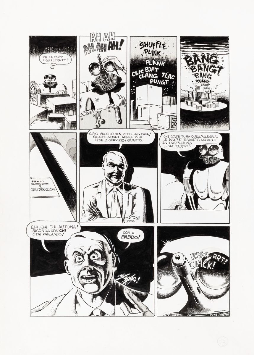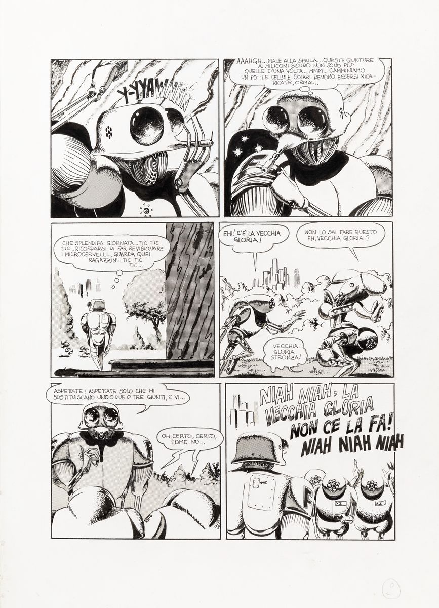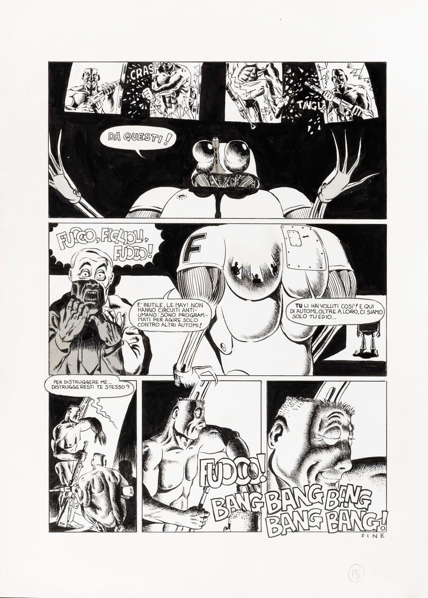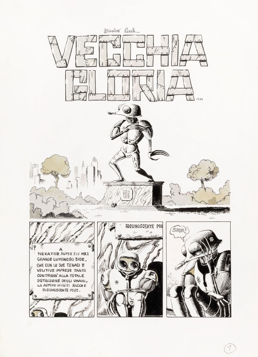 Complete story made up of 15 original comic arts made by Scozzari for "Vecchia gloria" published for the first time on the pages of Cannibale n. 13 in 1976. Signed under the pseudonym Winslow Leech on page 1, 6 and 10 and dated.