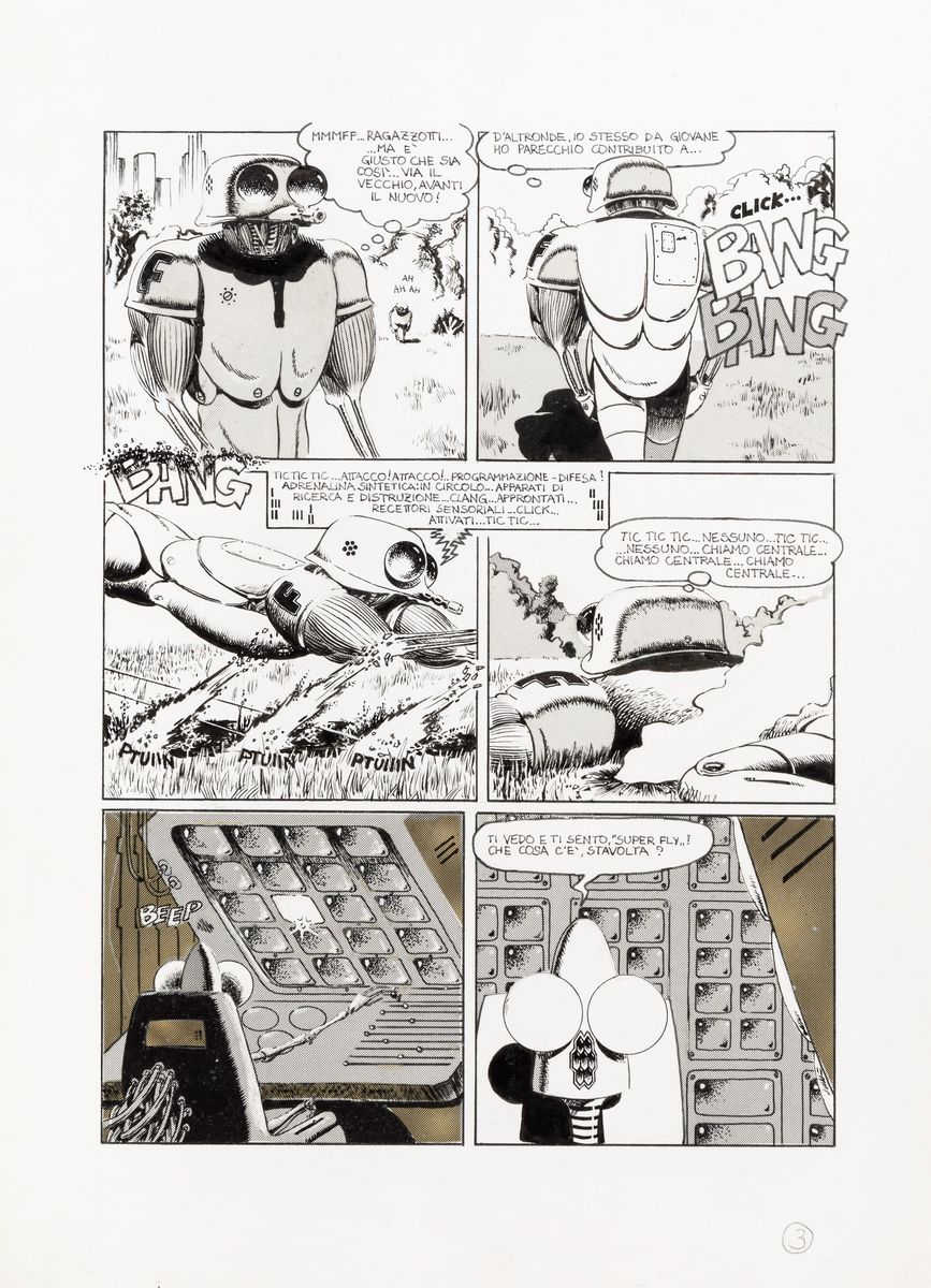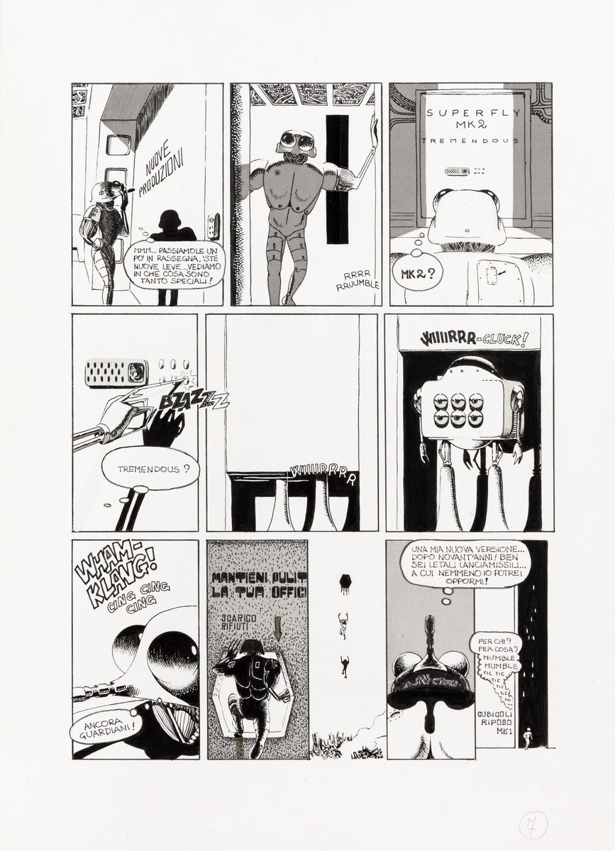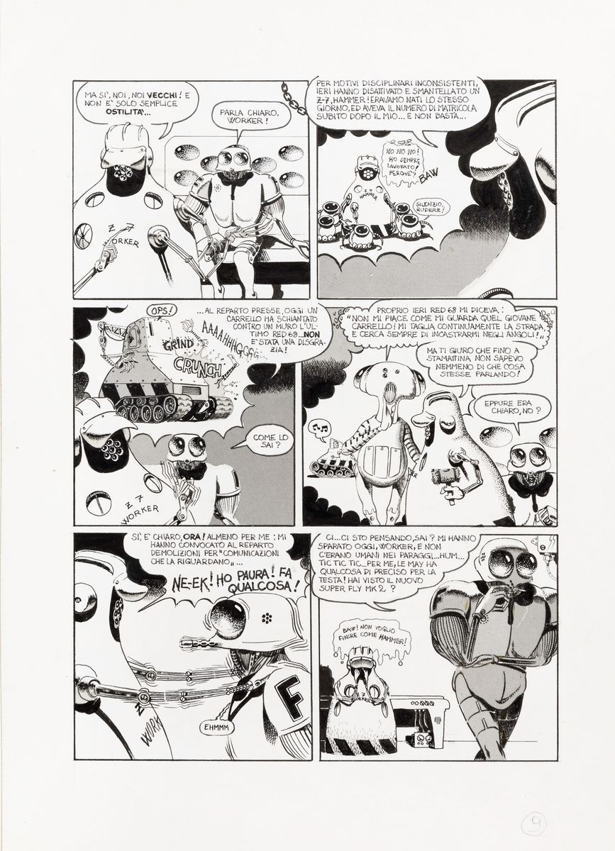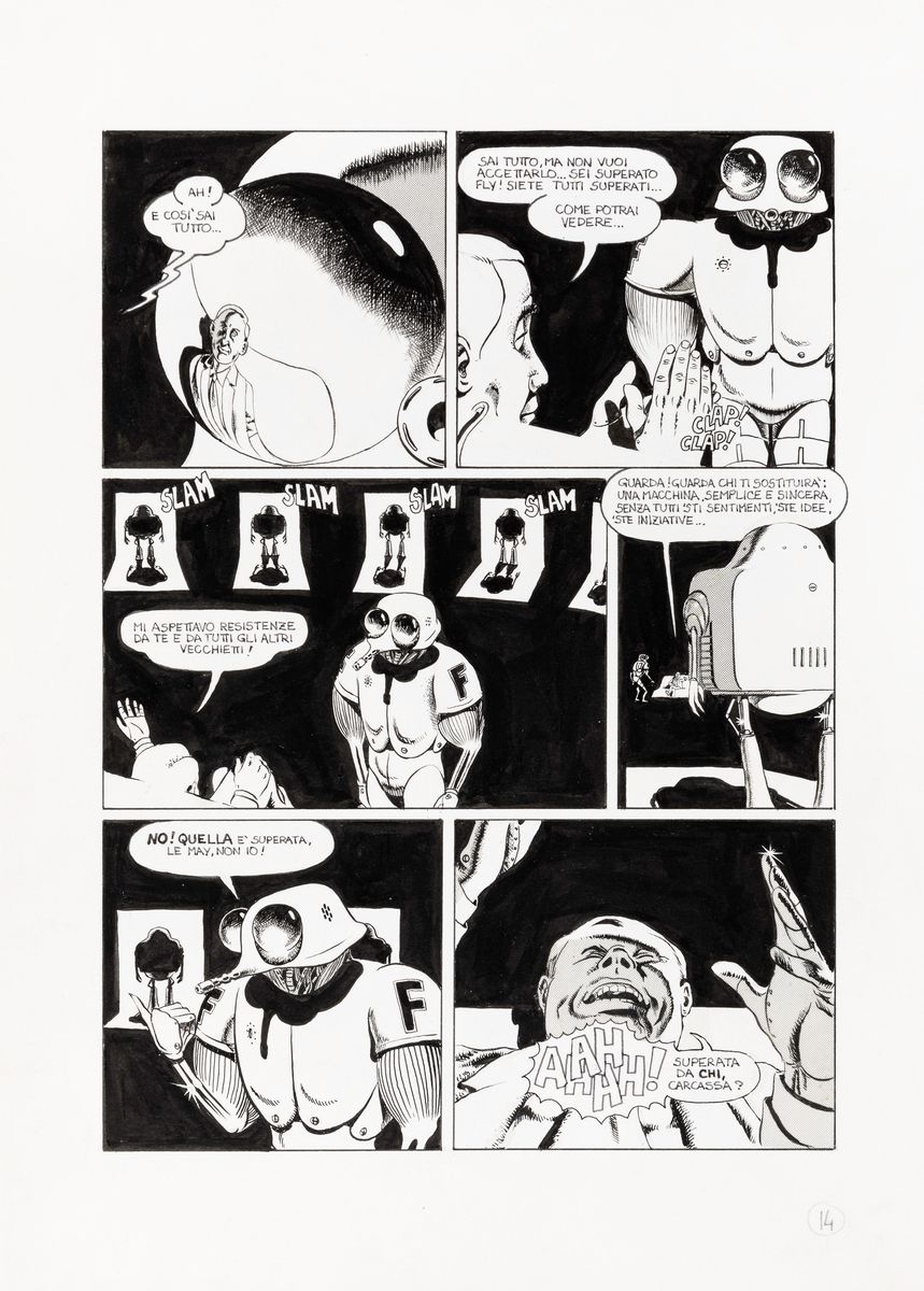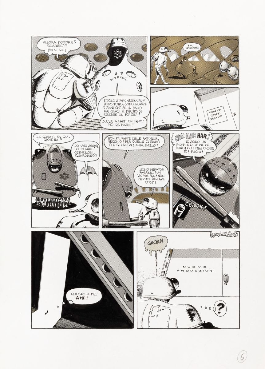 Complete story made up of 15 original comic arts made by Scozzari for "Vecchia gloria" published for the first time on the pages of Cannibale n. 13 in 1976. Signed under the pseudonym Winslow Leech on page 1, 6 and 10 and dated.