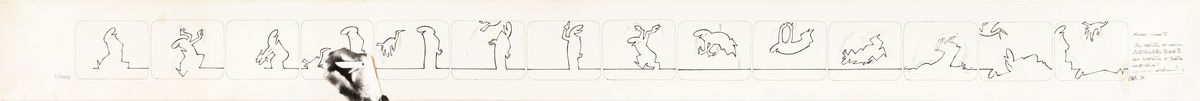Original strip made by Cavandoli for his famous character La Linea. A majestic and brilliant work enclosed in 14 vignettes. A museum piece. Small tear at the bottom edge, stored inside the original packing tube. Signed, dated and dedicated to the famous Roman director Alessandro Blasetti.