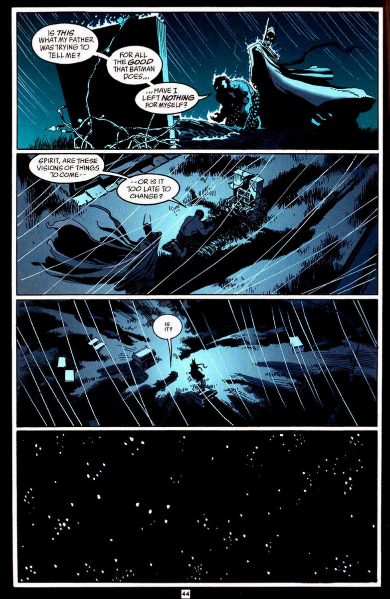 Original comic art made by Sale for "Batman Ghosts: A Legends of the Dark Knight Halloween Special" published on page. 44 by DC in 1995. In this page we see the epilogue of this long night, the last spirit is a hooded man who shows Bruce his coffin revealing to him how few will miss him if he keeps pushing all loved ones away from himself; the hooded man is Bruce himself in the Batman suit, but his appearance is that of a hideous skeleton. Of great rarity.