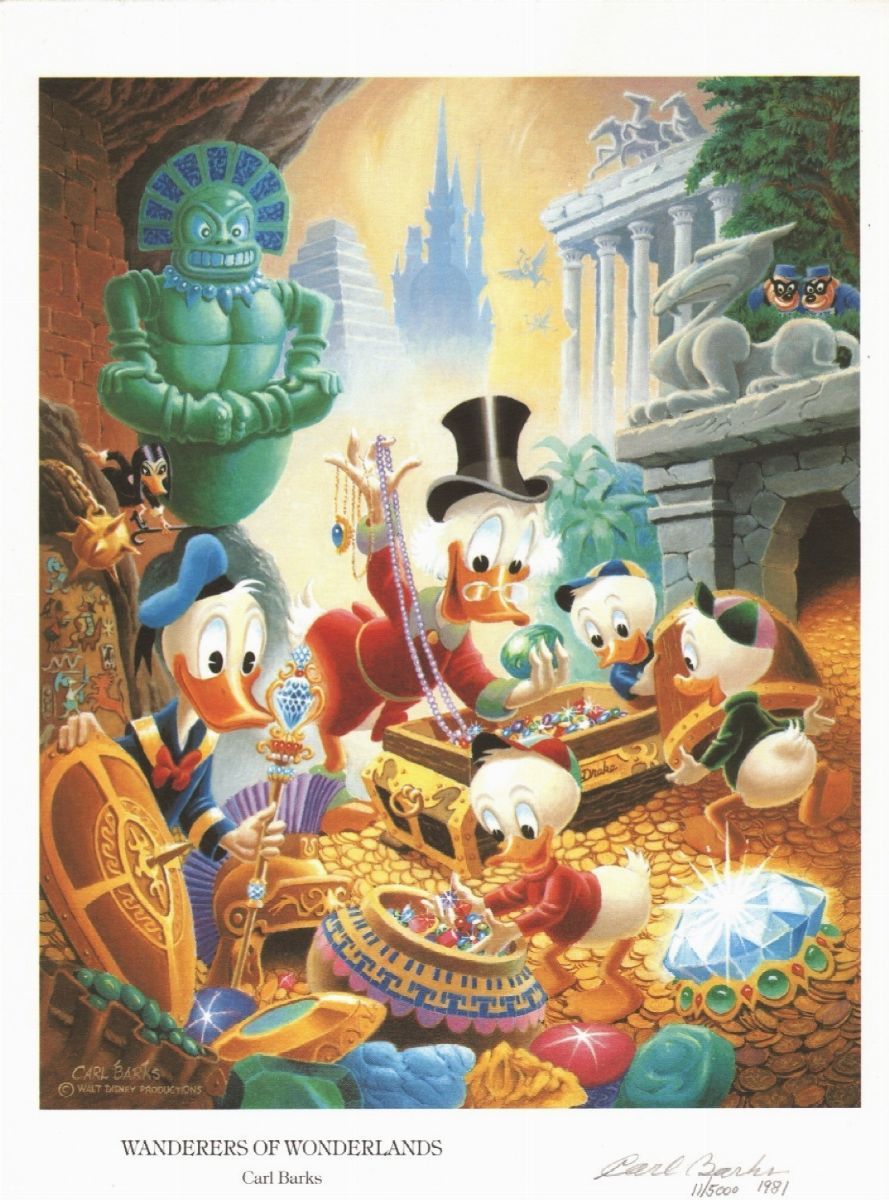 Preliminary drawing made by Barks for his famous oil painting entitled "Wanderers of Wonderlands" executed in 1981. The father of ducks created this painting, taking inspiration from one of his adventures published in 1954 with the title "Uncle Scrooge and the seven cities of Cibola" in which Uncle Scrooge and his nephews go in search of the 7 legendary cities of gold founded in New Mexico following the Arab conquest of the Spanish city of Merida. We know that Barks was particularly fond of this story as it was the first occasion in which Uncle Scrooge goes in search of hidden and legendary treasures around the world, a theme that will later become recurring (as well as one of the most fascinating) in the character's adventures. Signed in pen by the author.