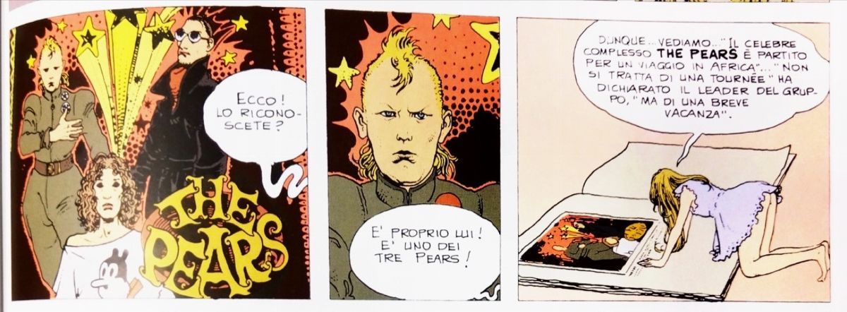 Original strip made by Manara for the volume "The African Adventures of Giuseppe Bergman" published for the first time by the French publishing house Casterman in 1982. A dreamlike strip in which Manara through the punk rock group The Pears decided to pay homage to his colleagues and friends more visionary: Moebius, Pazienza and Liberatore...it is no coincidence that he chose such a particular name for this musical trio. Signed.