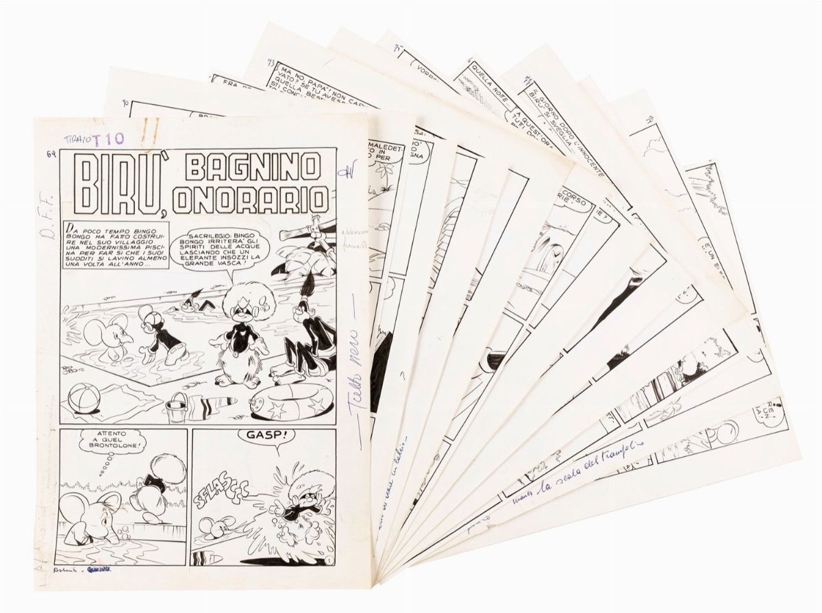 Complete story composed of 12 original comic arts made by Asteriti for "Birù, honorary lifeguard", an adventure by Bingo Bongo king of Tongo published for the first time in the Gaie Fantasie magazine in the early 1950s and subsequently in Tiramolla by Edizioni Alpe.