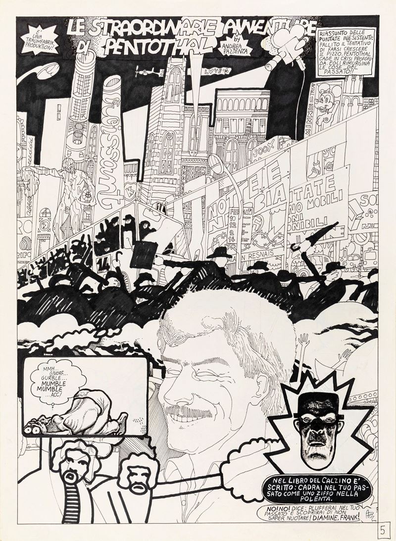 Original comic art made by Pazienza for his first work "The extraordinary adventures of Pentothal" (page 33) published for the first time in the magazine Alter Alter in 1977. "The extraordinary adventures of Pentothal", a work made by Pazienza at just 21 years old , is the detailed diary of the dreams, illusions and contradictions of its author and of an entire generation, that of Bologna in 1977. The language is a riot of slang, onomatopoeia, neologisms and ungrammatical terms. The graphic trait is a happy expressive anarchy between suggestions of Pop art and airy hatchings on the Moebius model. Signed.