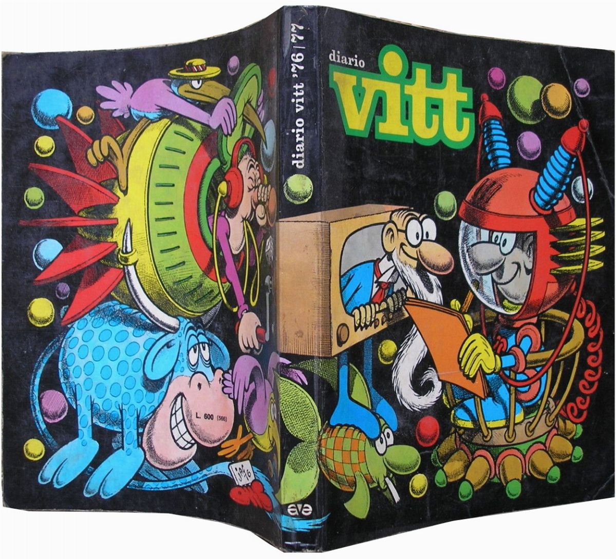 Original cover and back cover made by Jacovitti for the Diario Vitt 1976/1977 published by Edizioni AVE. Watercolored on the back. A copy of the publication is attached. Slight folds and small tears on the left and top margins. A museum piece. Signed with fishbone and dated.