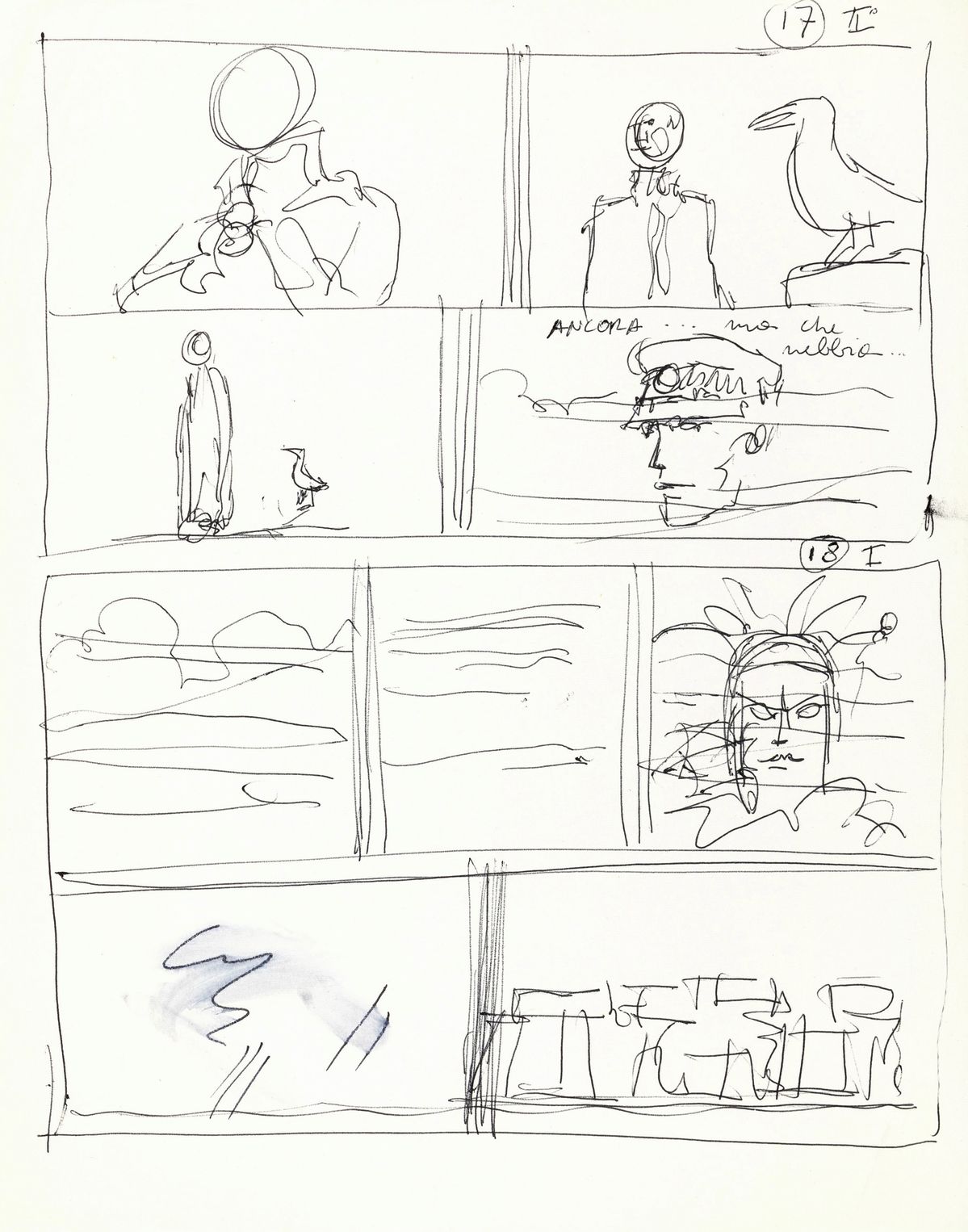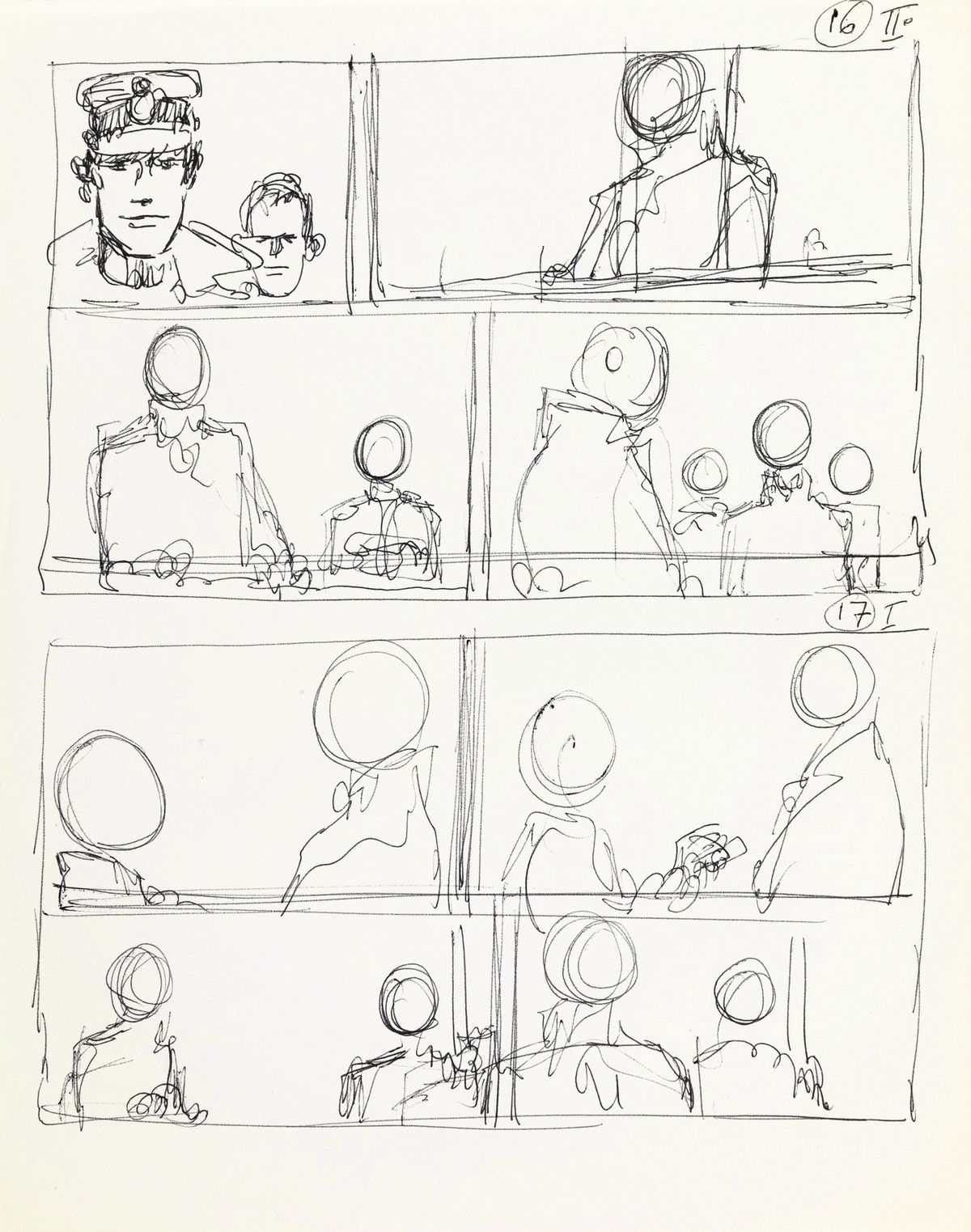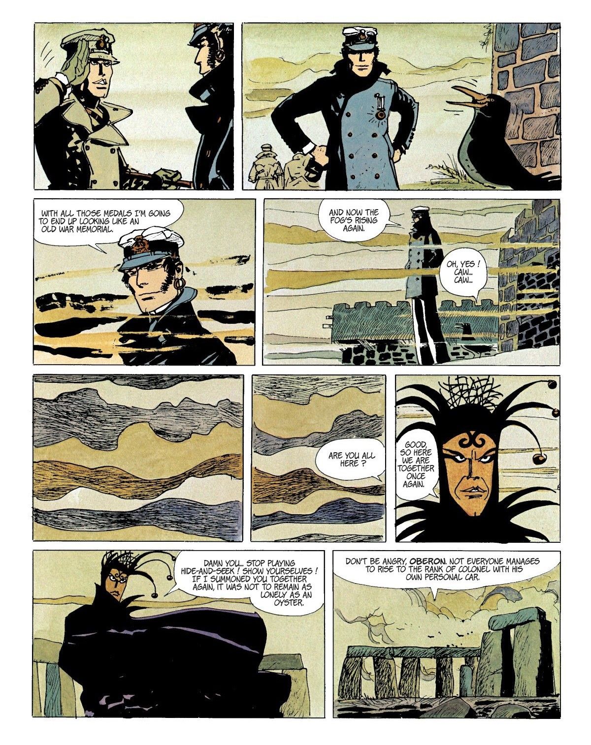 Lot composed of 3 preliminary comic arts made by Pratt for the sixteenth Corto Maltese adventure entitled "Dream of a Midwinter Morning", published for the first time in France on Pif Gadget in 1972. In 1917 Corto is at Stonehenge, in England. While he sleeps, the meeting between four fantastic creatures of Anglo-Saxon mythology takes place: Puck, Oberon, Morgana and Merlin and the reason is the need to find someone who can counter the imminent landing of the Germans which threatens to wipe out the magical world of these beings; the choice falls on Corto Maltese. For the first time we have the opportunity to peek into the creative process of the great Pratt, in these sketchy but already fully evocative tables, we can admire Corto immersed in the fog of Stonehenge while talking to Puck in the form of a raven, we then see the beautiful Rowena and the German soldier Vortigern. Provenance: Heritage Auction - Lot #91200 - Jun 8, 2019.