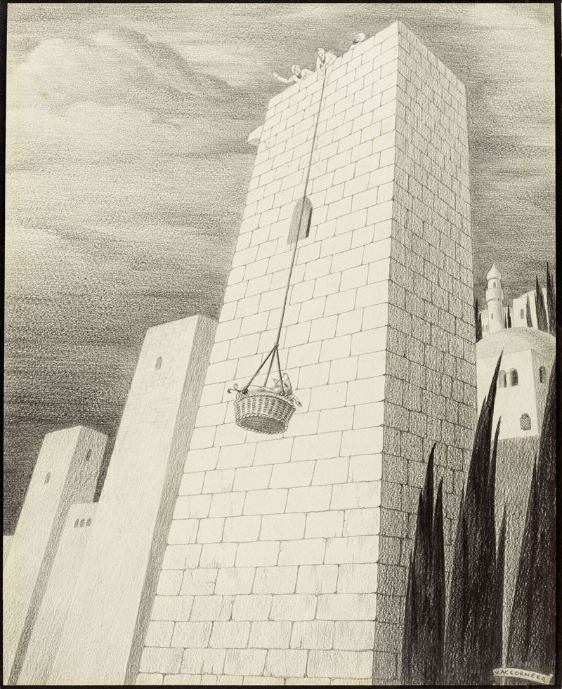 Original illustration made by Accornero for the story "A Story of Jerusalem" by Edgar Allan Poe, published in the two volumes "Fantastic Tales - Various Stories" by the Italian Editorial Institute in 1959. << Vittorio Accornero followed, with a very acute vein fantastic, the painful, hallucinated, anguished and bitterly voluptuous movement of his characters, floating, if it can be said so, in a superior reality, in the imponderable reality of the Dream >> (from the preface by Orio Vergani). Small dent on the lower left corner. Signed.