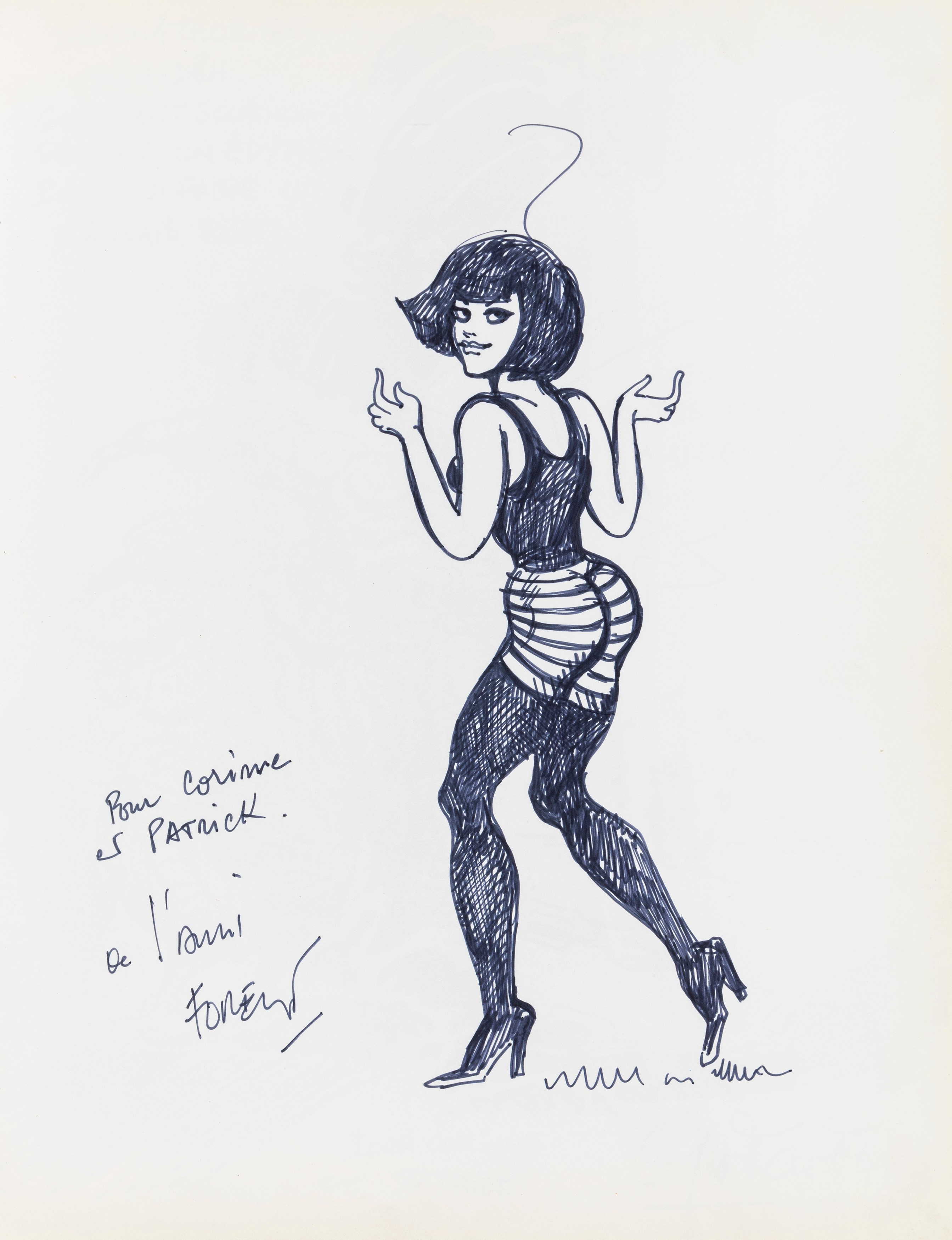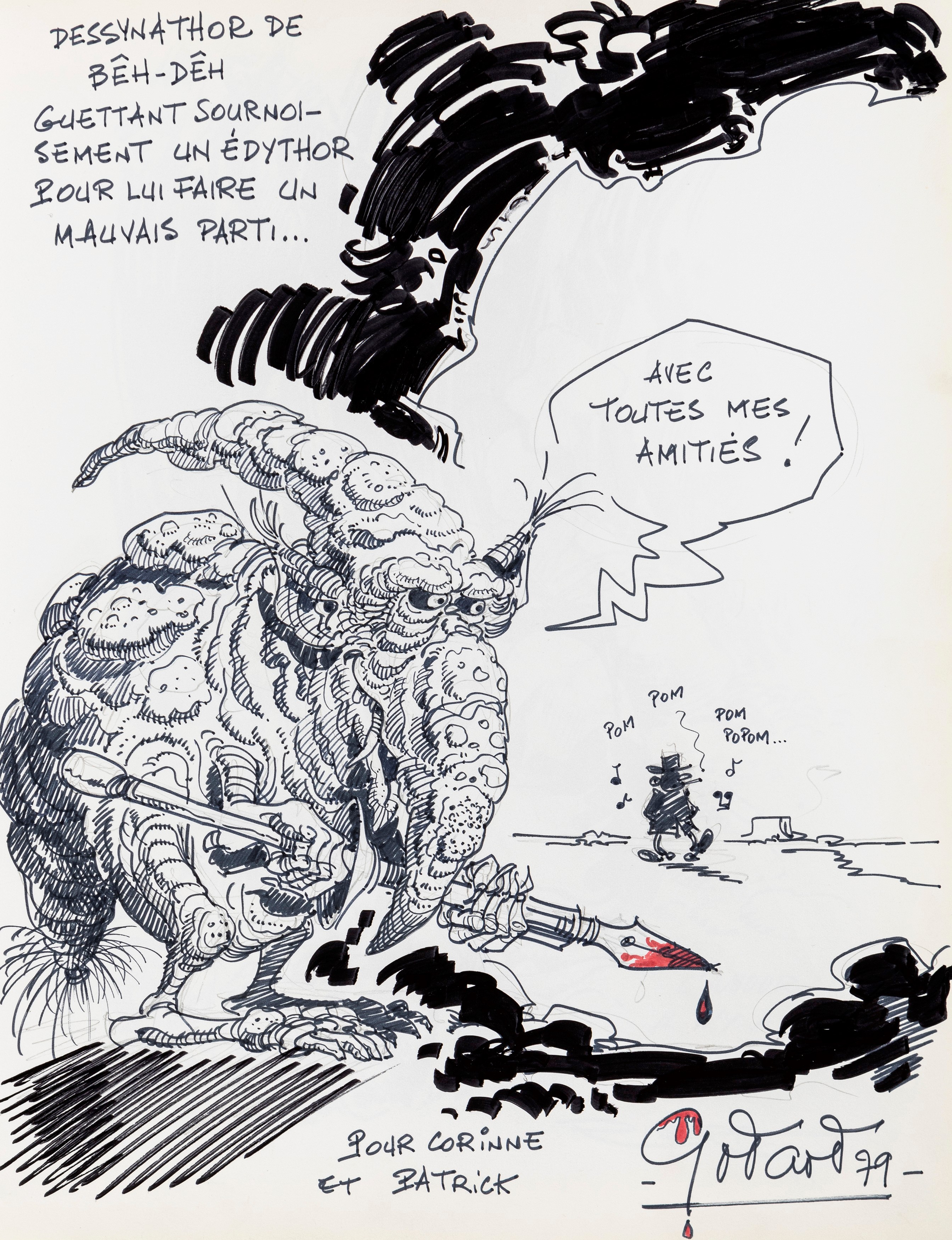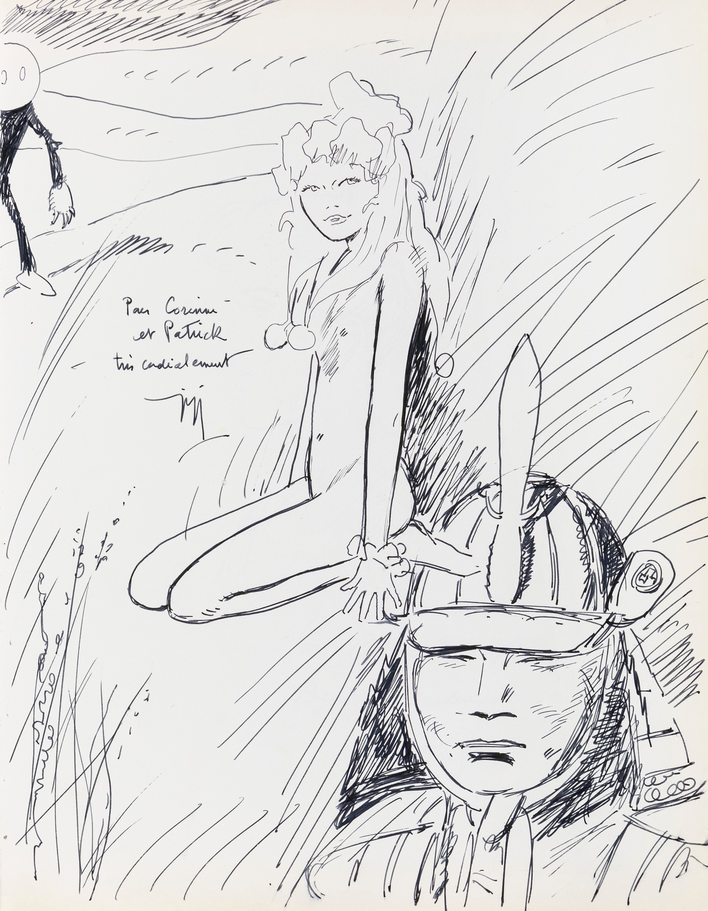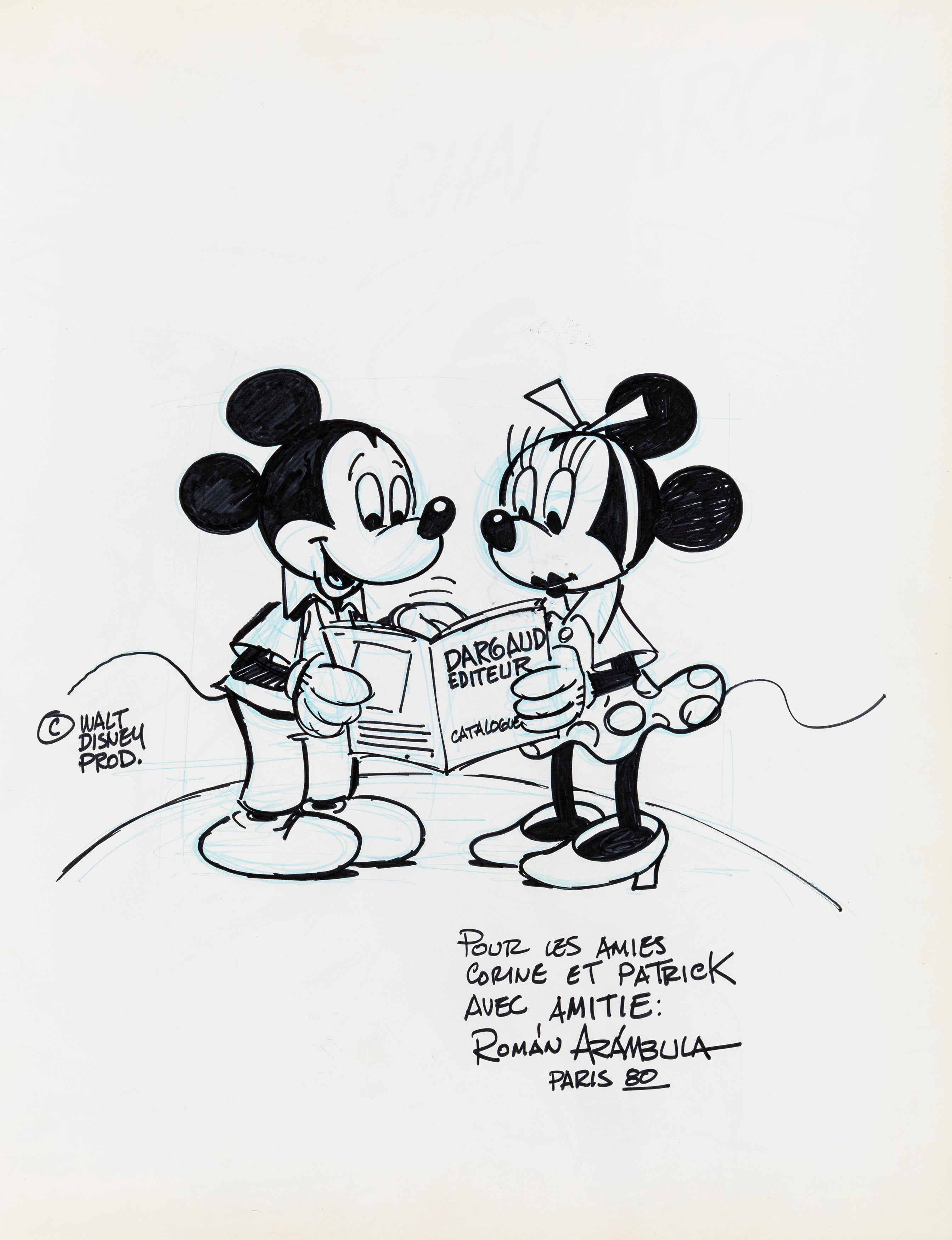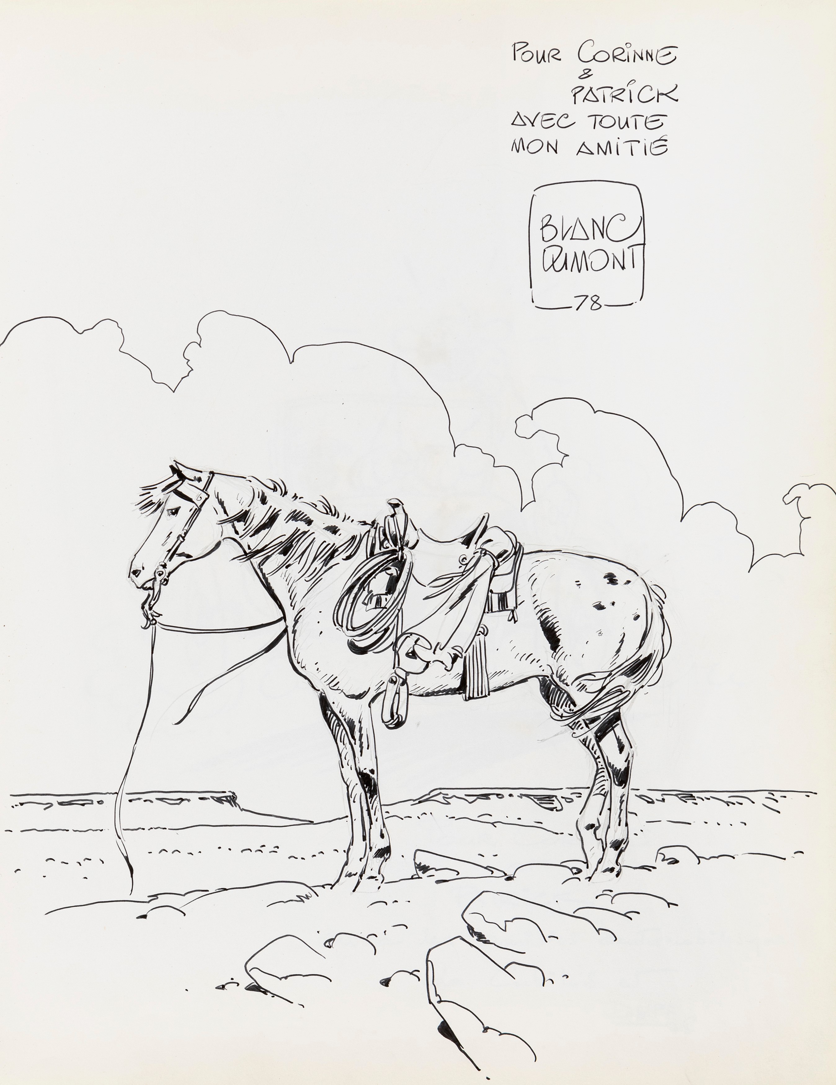 Lot of 35 original drawings contained in a "livre d'or" (guest book) that belonged to the famous French publisher Georges Dargaud and his daughter Corinne. All the drawings are dedicated to Corinne Dargaud and her husband Patrick Verdin and are dated between 1976 and 1988, bringing together the greatest names in European comics of those years. Among the many authors we find Hugo Pratt, Morris (Maurice de Bevere), Enki Bilal, Greg (Michel Regnier), Michel Blanc-Dumont, Dupa (Luc Dupanloup), Antonio Hernandez Palacios, Walter Fahrer, Mic Delinx (Michel Houdelinckx), Claude Marin, Jean-Claude Mézières, Dany (Daniel Henrotin), William Vance, Jean-Claude Forest, Julio Ribera, Robert Gigi, Fred (Frédé ric Othon), Gérard Lauzier, F'Murrr (Richard Peyzaret), Román Arámbula, Pierre-Léon Dupuis, Copi (Raúl Damonte Botana), Turk (Philippe Liégeois), Annie Goetzinger, Yves Bordes, Philippe Bertrand, Jean-Pierre Autheman, David Pascal, ecc... The book is hardback, bound in red cloth and in the second page there is the dry stamp of the Bibliothèque personnelle Georges Dargaud - Corinne Dargaud. Provenance: "Dessins" auction by Lasseron & Associés on 24 February 2006.