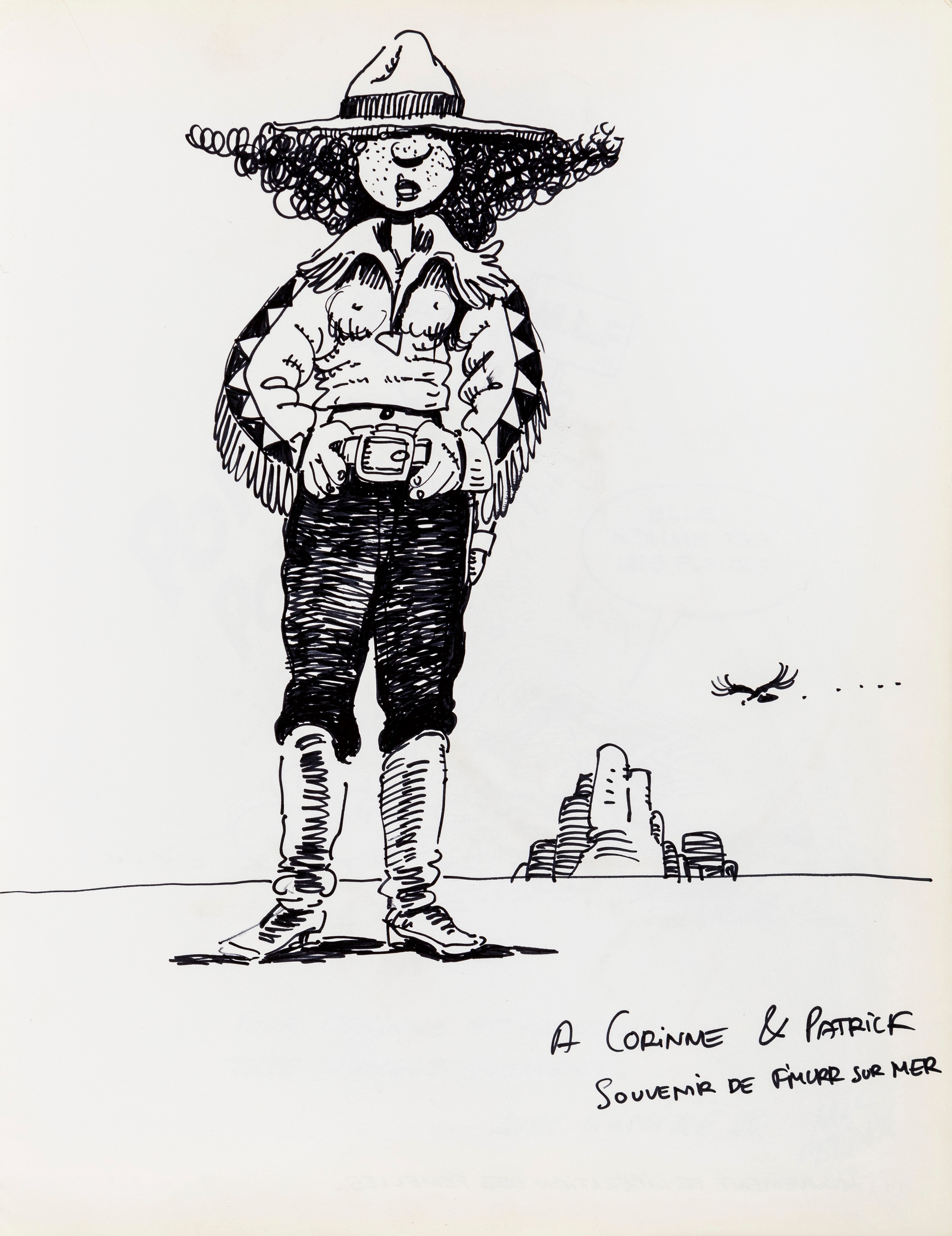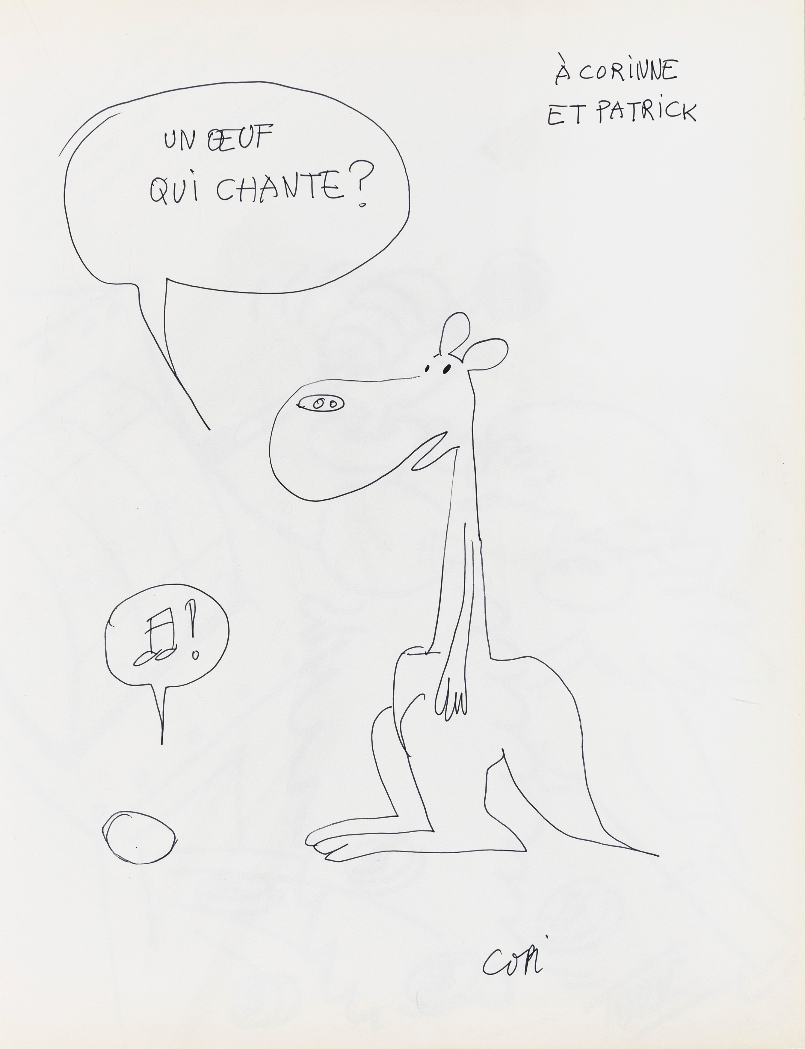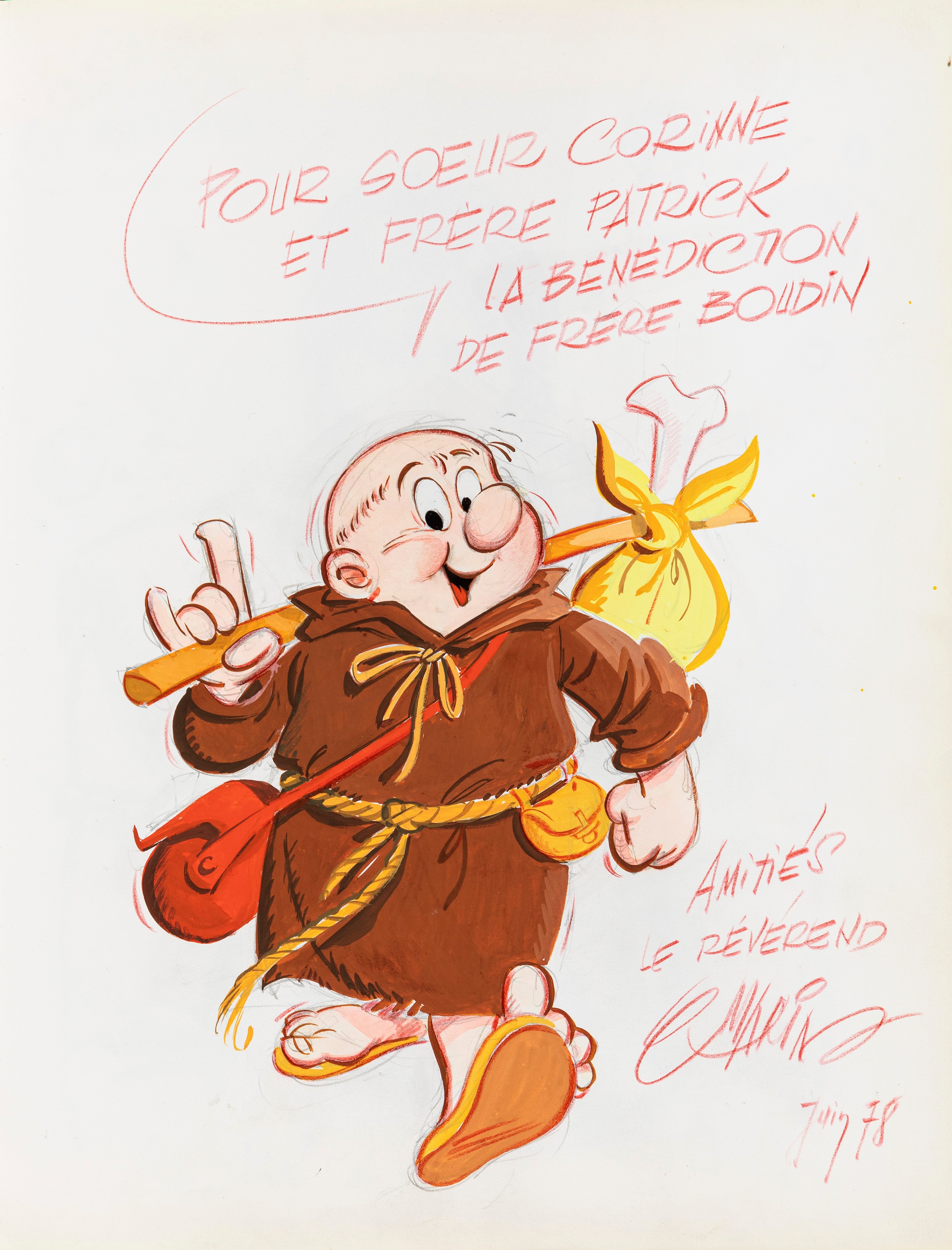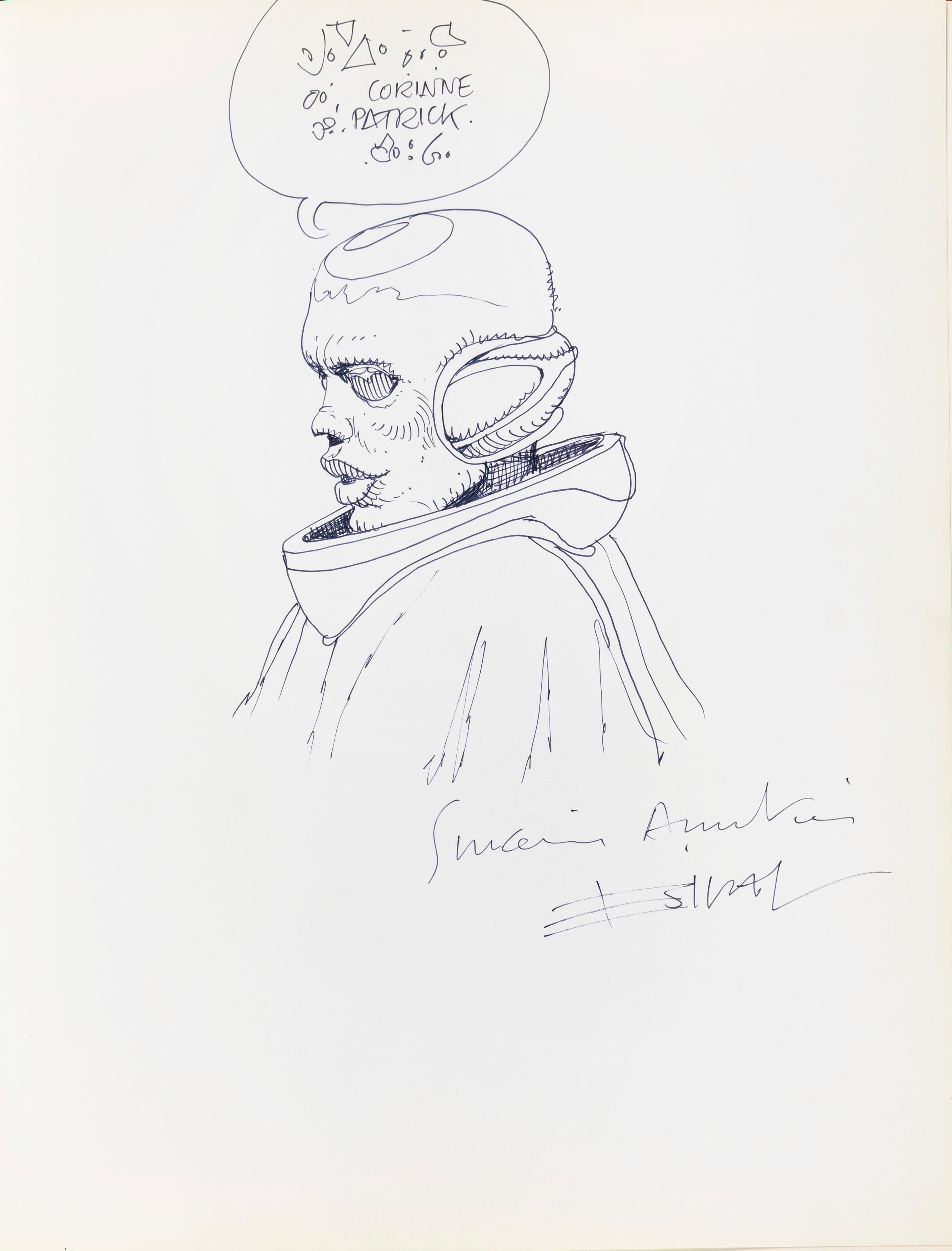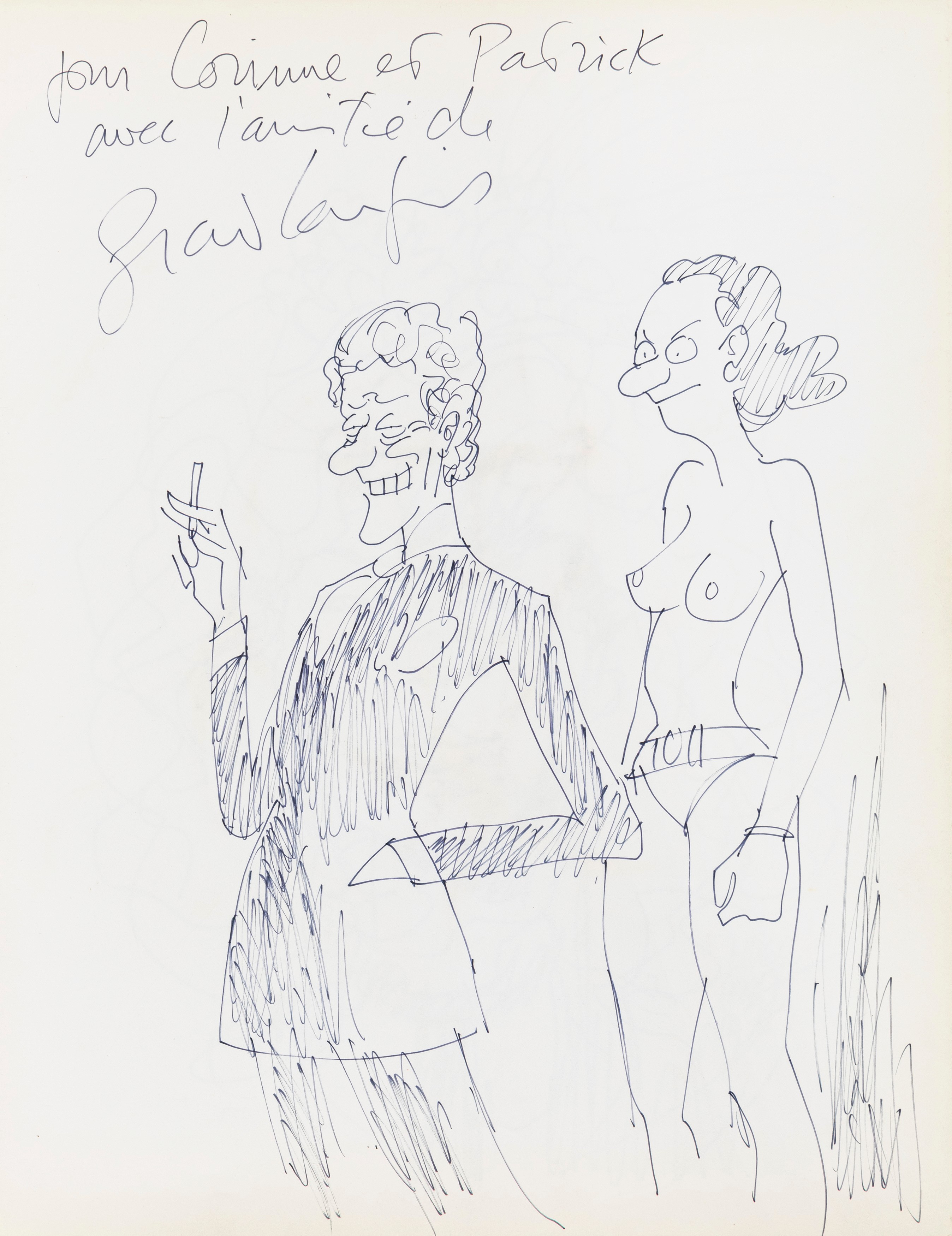 Lot of 35 original drawings contained in a "livre d'or" (guest book) that belonged to the famous French publisher Georges Dargaud and his daughter Corinne. All the drawings are dedicated to Corinne Dargaud and her husband Patrick Verdin and are dated between 1976 and 1988, bringing together the greatest names in European comics of those years. Among the many authors we find Hugo Pratt, Morris (Maurice de Bevere), Enki Bilal, Greg (Michel Regnier), Michel Blanc-Dumont, Dupa (Luc Dupanloup), Antonio Hernandez Palacios, Walter Fahrer, Mic Delinx (Michel Houdelinckx), Claude Marin, Jean-Claude Mézières, Dany (Daniel Henrotin), William Vance, Jean-Claude Forest, Julio Ribera, Robert Gigi, Fred (Frédé ric Othon), Gérard Lauzier, F'Murrr (Richard Peyzaret), Román Arámbula, Pierre-Léon Dupuis, Copi (Raúl Damonte Botana), Turk (Philippe Liégeois), Annie Goetzinger, Yves Bordes, Philippe Bertrand, Jean-Pierre Autheman, David Pascal, ecc... The book is hardback, bound in red cloth and in the second page there is the dry stamp of the Bibliothèque personnelle Georges Dargaud - Corinne Dargaud. Provenance: "Dessins" auction by Lasseron & Associés on 24 February 2006.