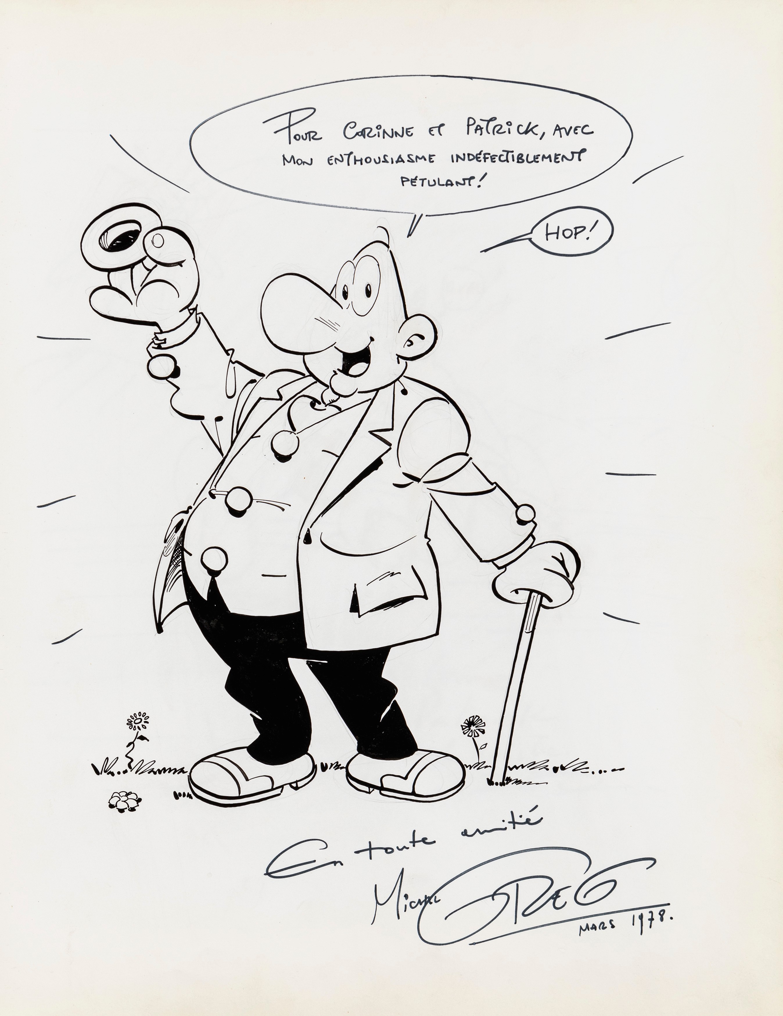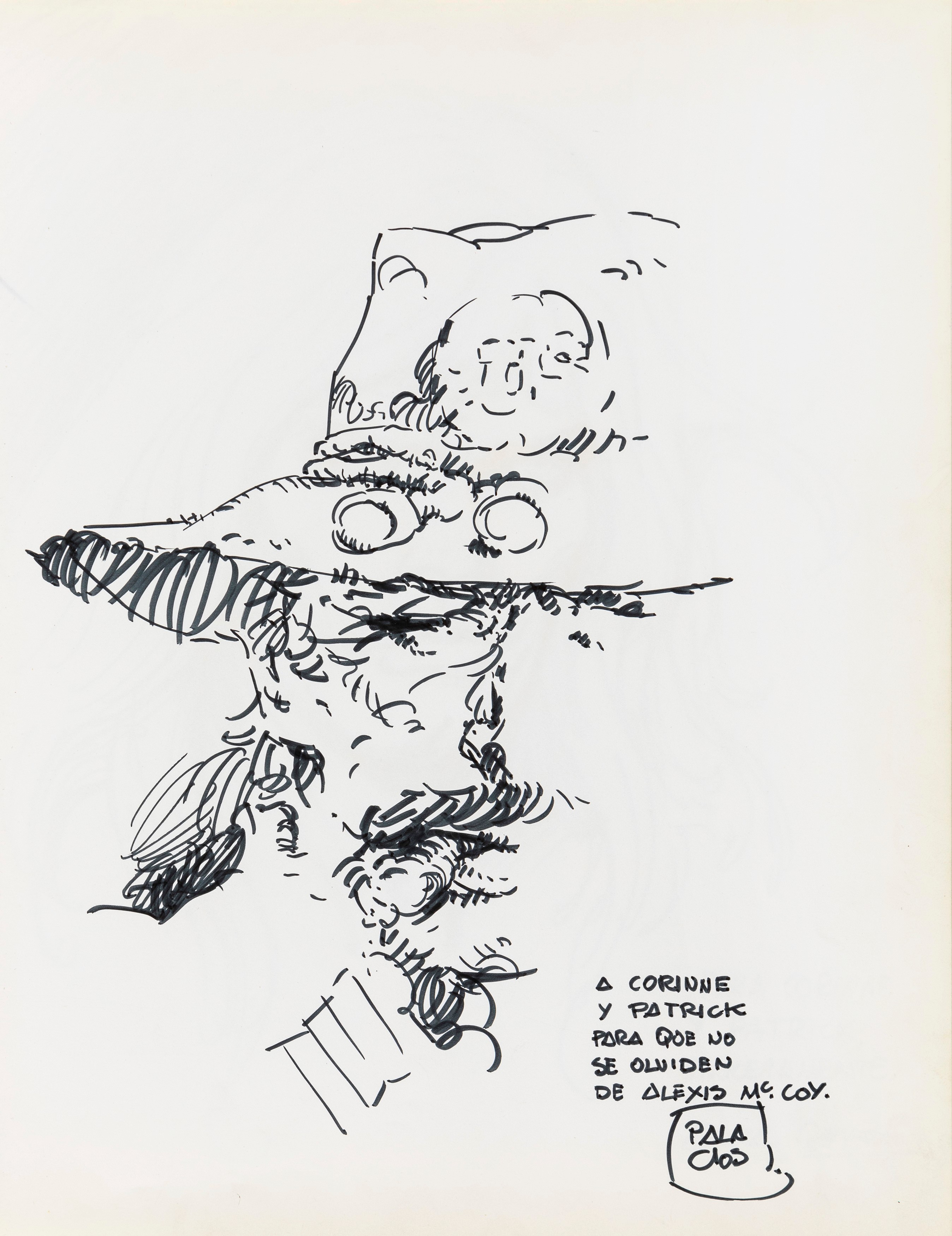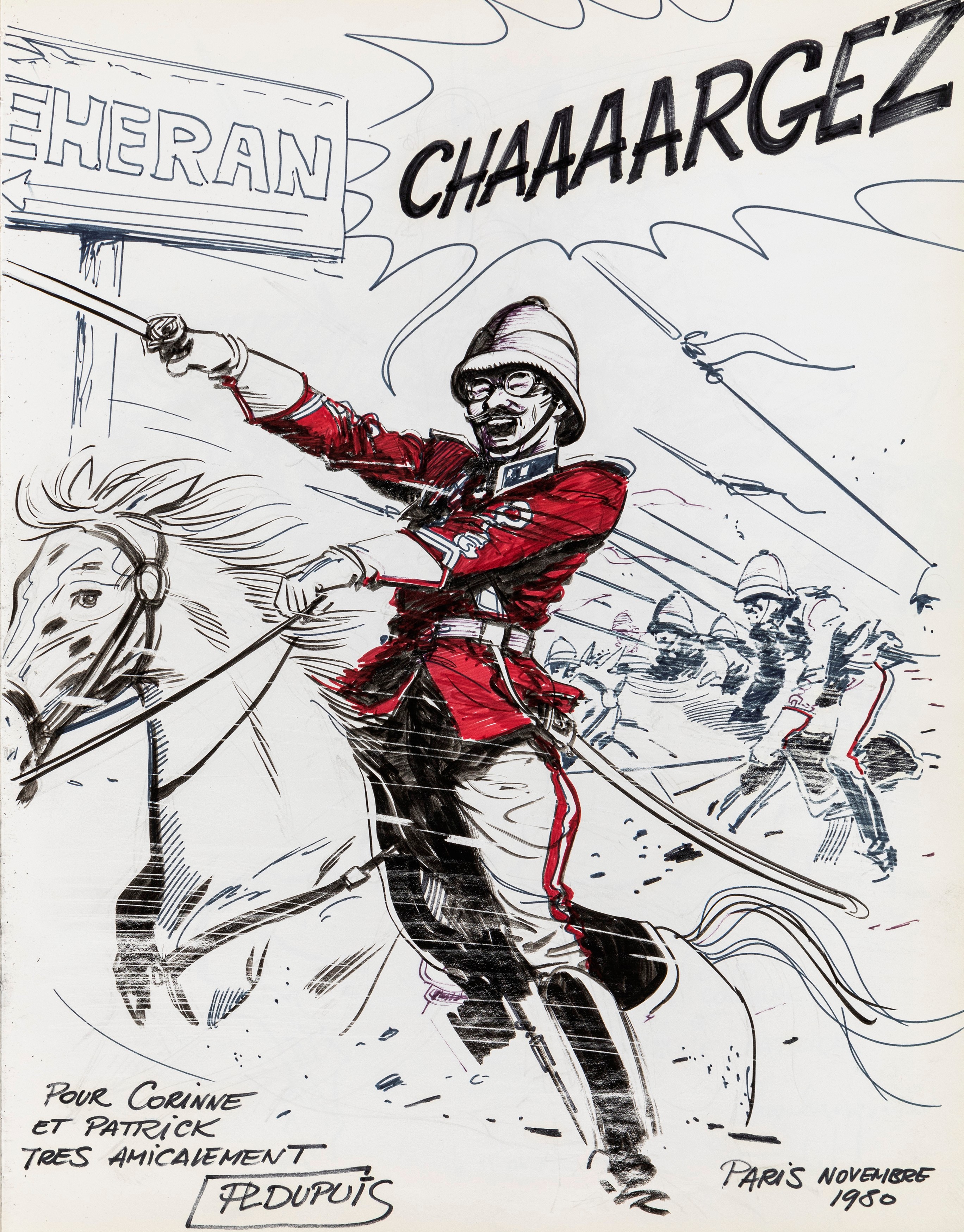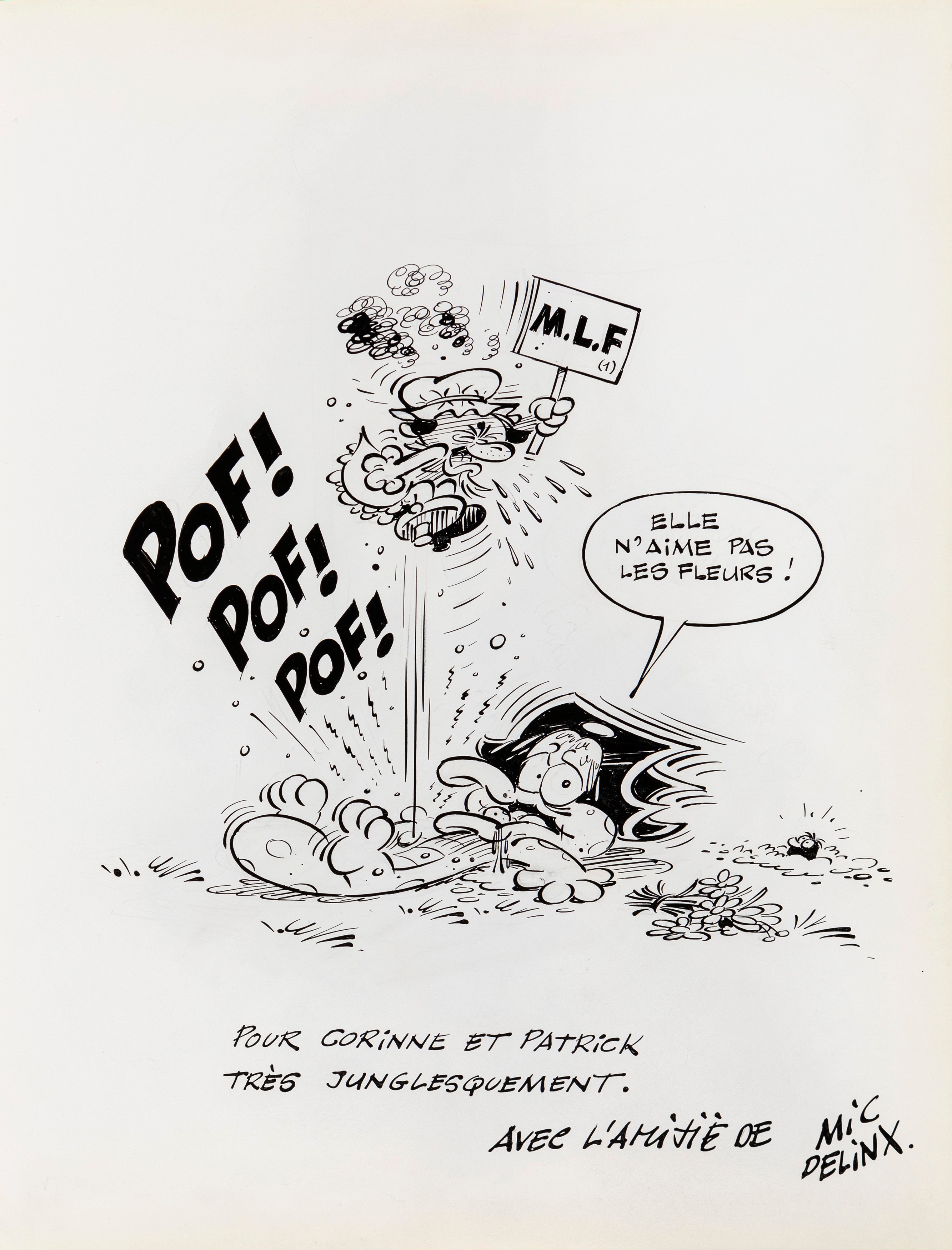 Lot of 35 original drawings contained in a "livre d'or" (guest book) that belonged to the famous French publisher Georges Dargaud and his daughter Corinne. All the drawings are dedicated to Corinne Dargaud and her husband Patrick Verdin and are dated between 1976 and 1988, bringing together the greatest names in European comics of those years. Among the many authors we find Hugo Pratt, Morris (Maurice de Bevere), Enki Bilal, Greg (Michel Regnier), Michel Blanc-Dumont, Dupa (Luc Dupanloup), Antonio Hernandez Palacios, Walter Fahrer, Mic Delinx (Michel Houdelinckx), Claude Marin, Jean-Claude Mézières, Dany (Daniel Henrotin), William Vance, Jean-Claude Forest, Julio Ribera, Robert Gigi, Fred (Frédé ric Othon), Gérard Lauzier, F'Murrr (Richard Peyzaret), Román Arámbula, Pierre-Léon Dupuis, Copi (Raúl Damonte Botana), Turk (Philippe Liégeois), Annie Goetzinger, Yves Bordes, Philippe Bertrand, Jean-Pierre Autheman, David Pascal, ecc... The book is hardback, bound in red cloth and in the second page there is the dry stamp of the Bibliothèque personnelle Georges Dargaud - Corinne Dargaud. Provenance: "Dessins" auction by Lasseron & Associés on 24 February 2006.