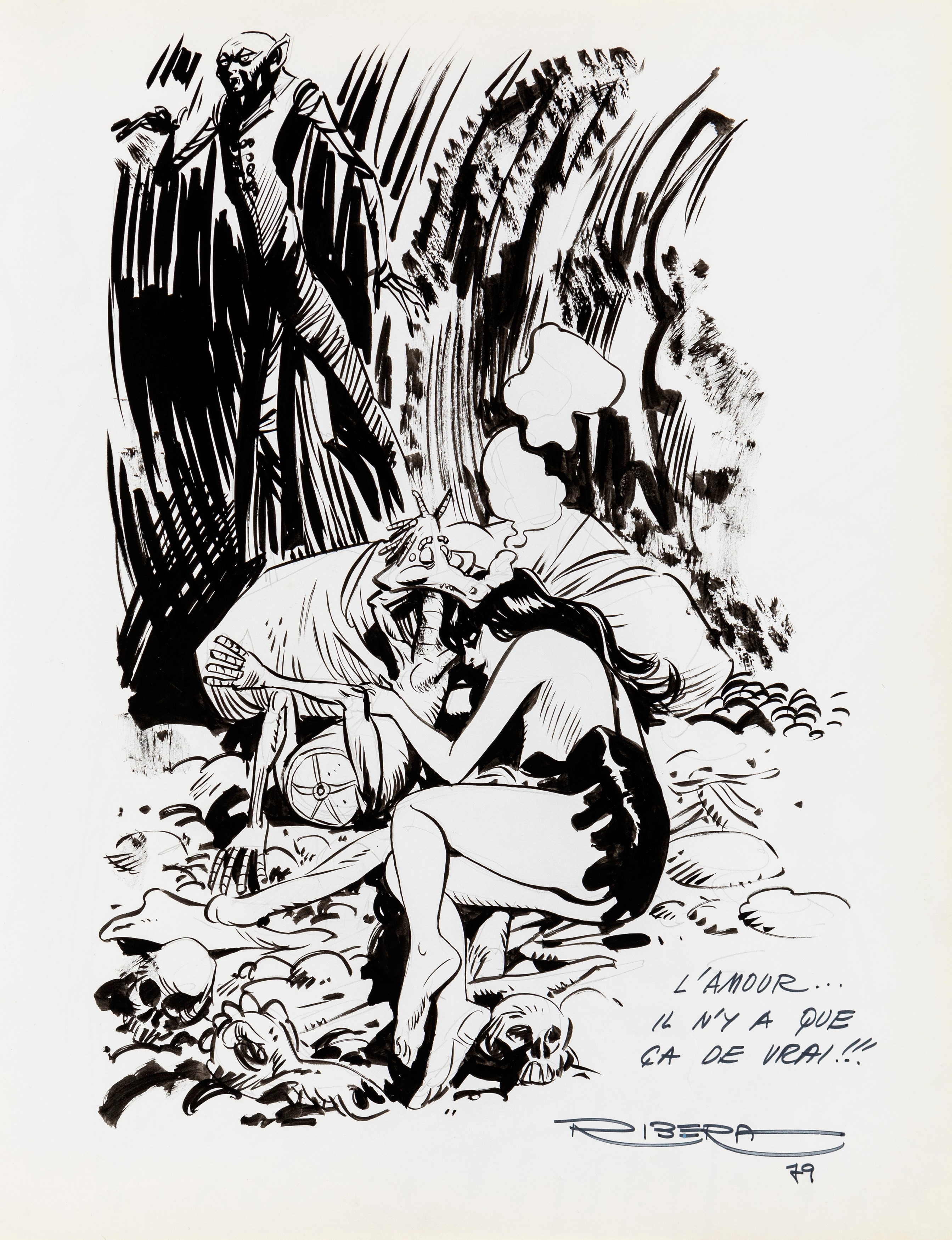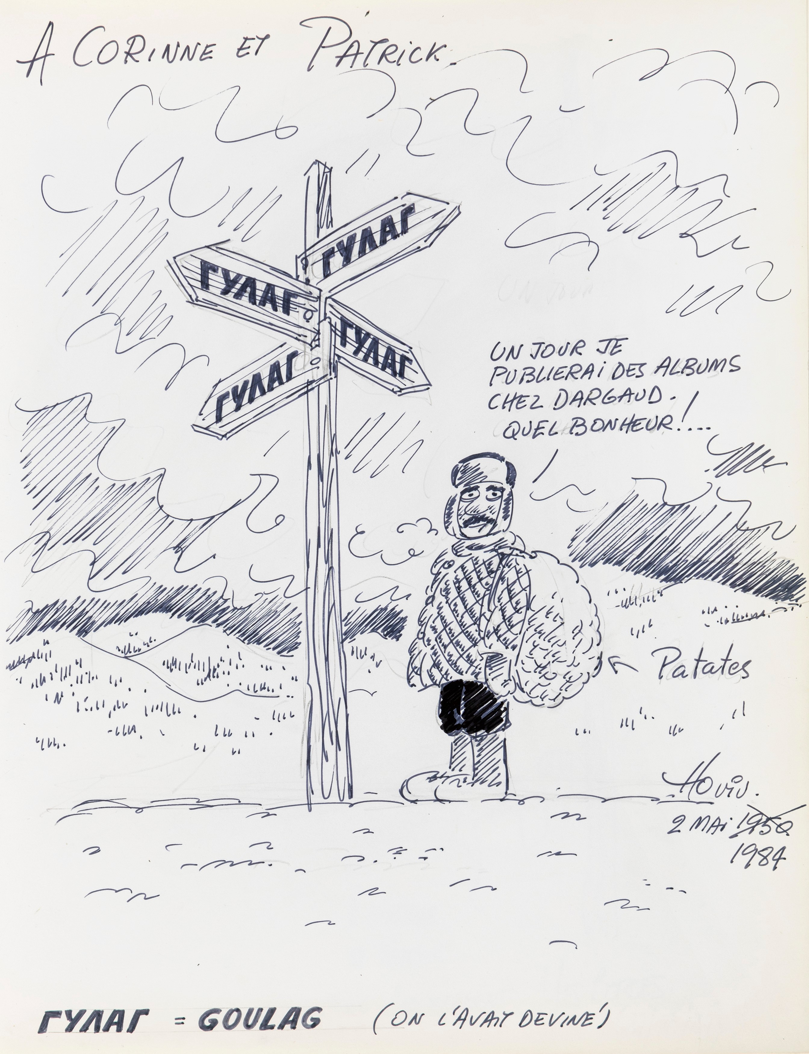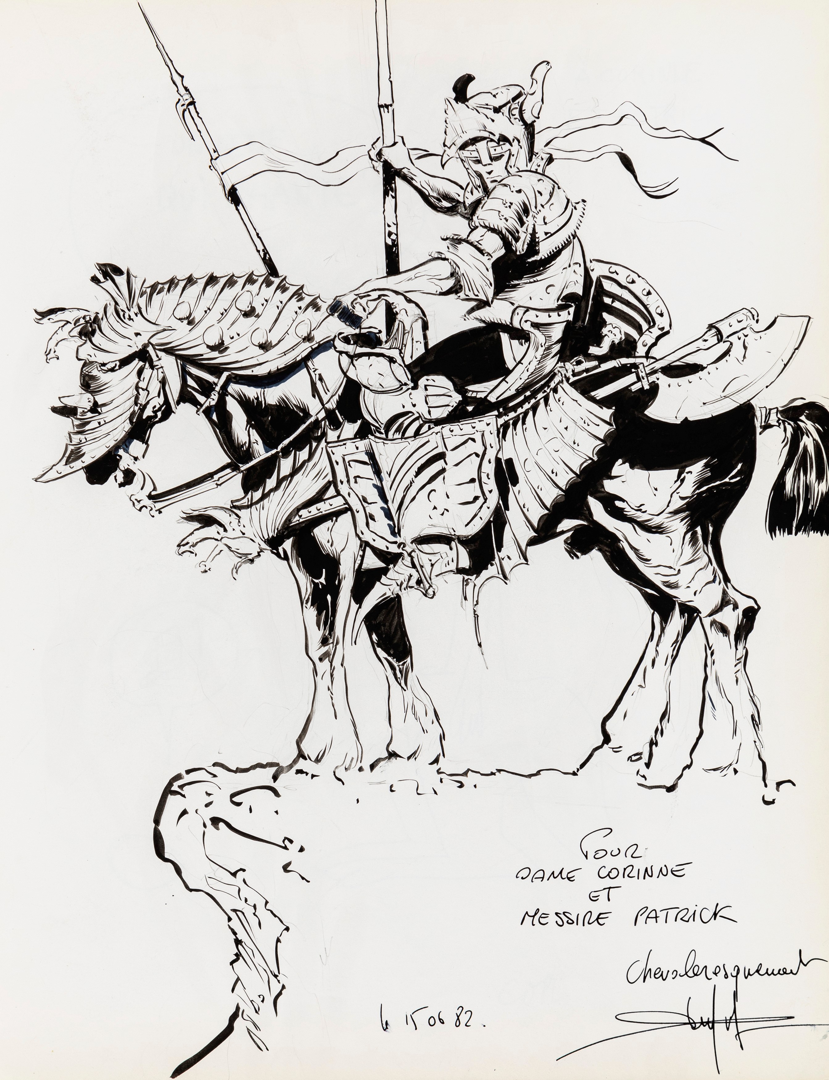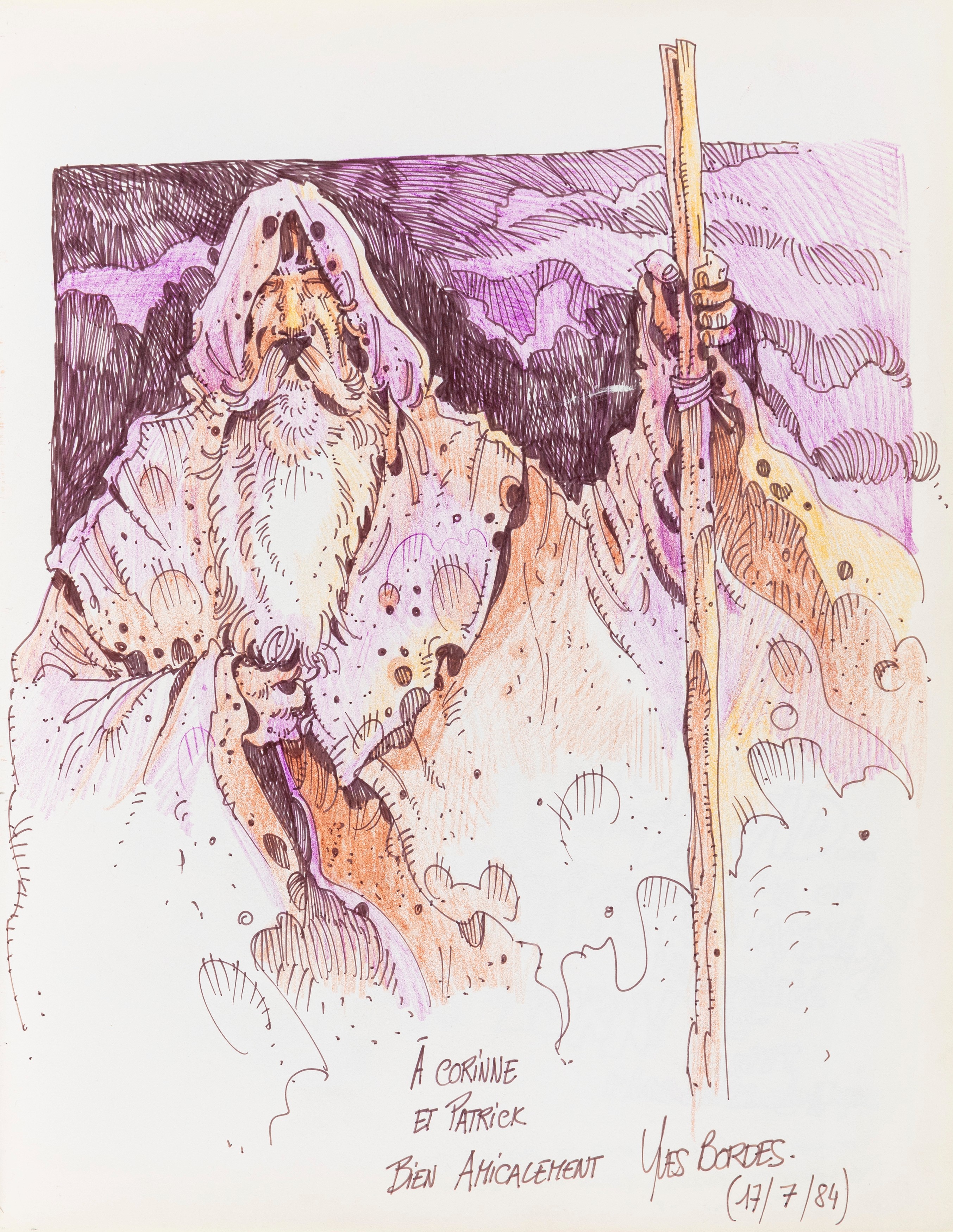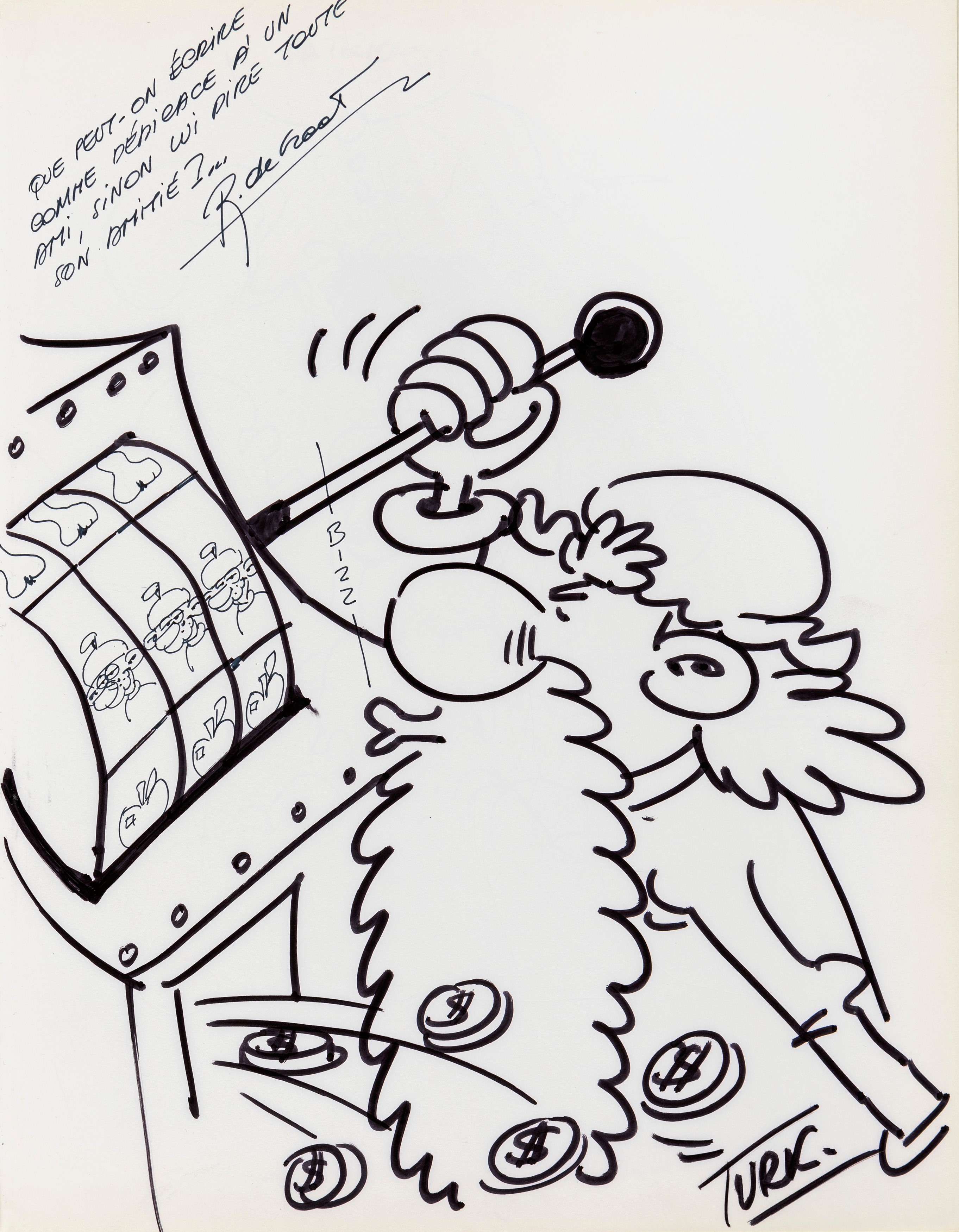 Lot of 35 original drawings contained in a "livre d'or" (guest book) that belonged to the famous French publisher Georges Dargaud and his daughter Corinne. All the drawings are dedicated to Corinne Dargaud and her husband Patrick Verdin and are dated between 1976 and 1988, bringing together the greatest names in European comics of those years. Among the many authors we find Hugo Pratt, Morris (Maurice de Bevere), Enki Bilal, Greg (Michel Regnier), Michel Blanc-Dumont, Dupa (Luc Dupanloup), Antonio Hernandez Palacios, Walter Fahrer, Mic Delinx (Michel Houdelinckx), Claude Marin, Jean-Claude Mézières, Dany (Daniel Henrotin), William Vance, Jean-Claude Forest, Julio Ribera, Robert Gigi, Fred (Frédé ric Othon), Gérard Lauzier, F'Murrr (Richard Peyzaret), Román Arámbula, Pierre-Léon Dupuis, Copi (Raúl Damonte Botana), Turk (Philippe Liégeois), Annie Goetzinger, Yves Bordes, Philippe Bertrand, Jean-Pierre Autheman, David Pascal, ecc... The book is hardback, bound in red cloth and in the second page there is the dry stamp of the Bibliothèque personnelle Georges Dargaud - Corinne Dargaud. Provenance: "Dessins" auction by Lasseron & Associés on 24 February 2006.