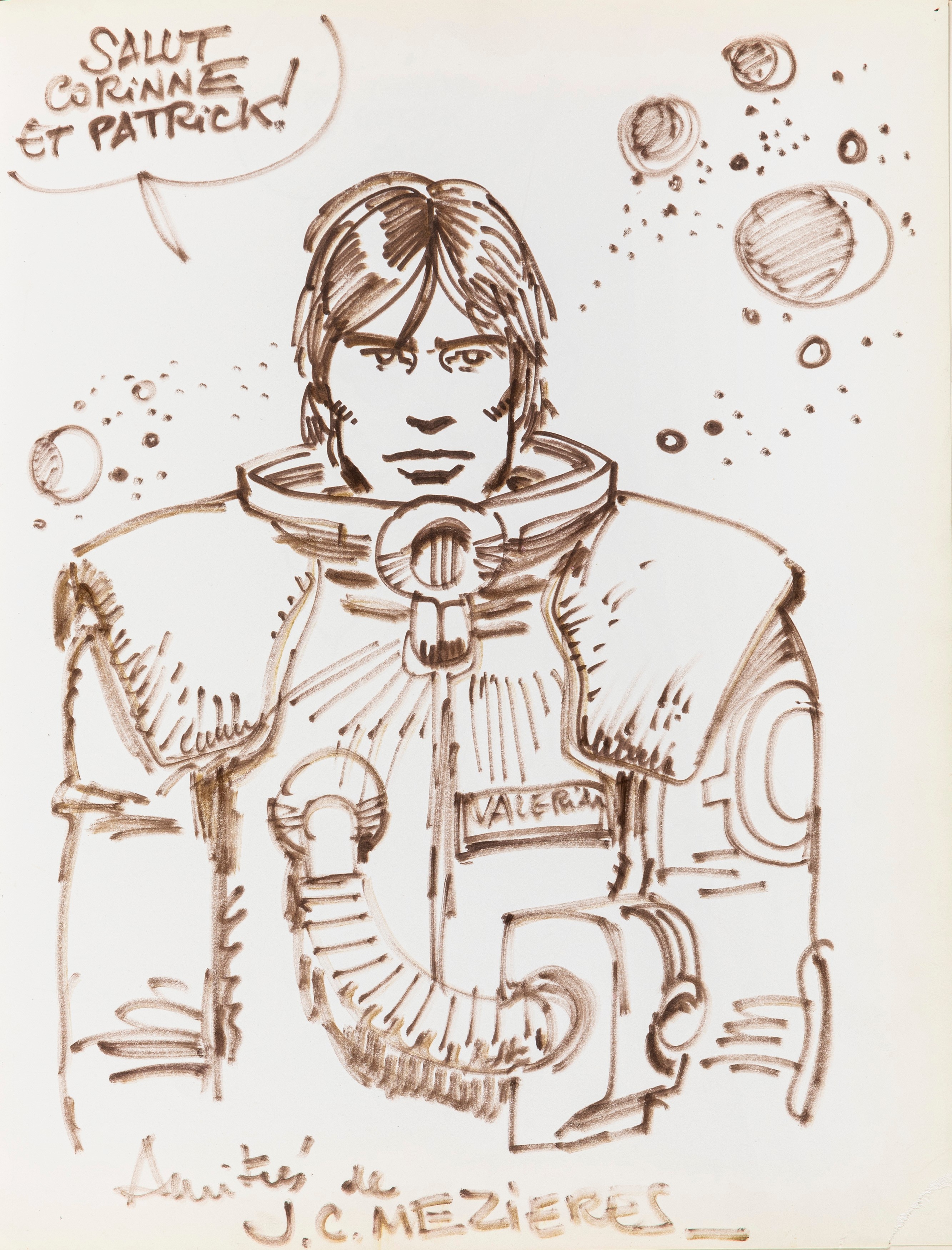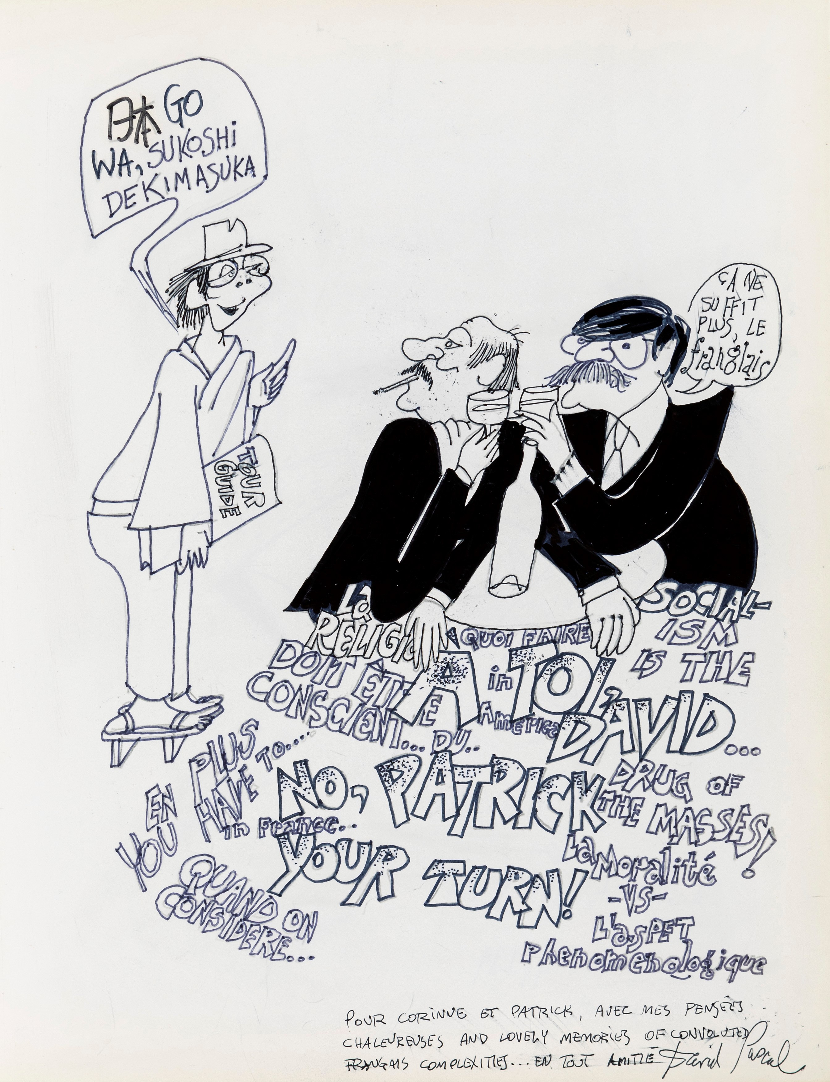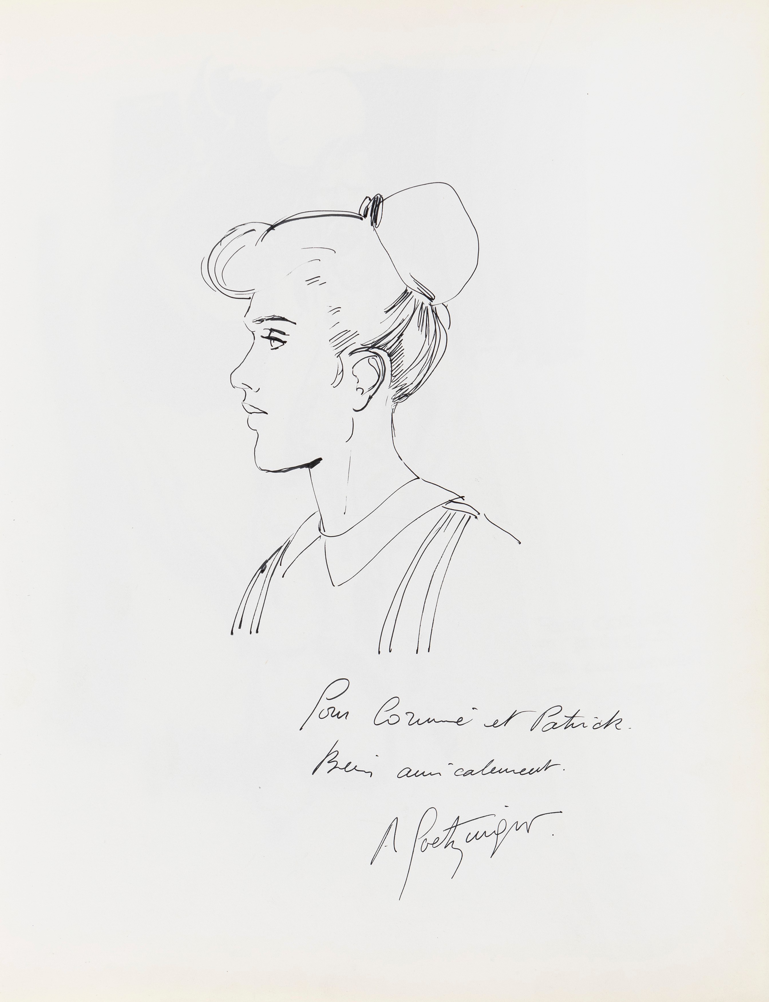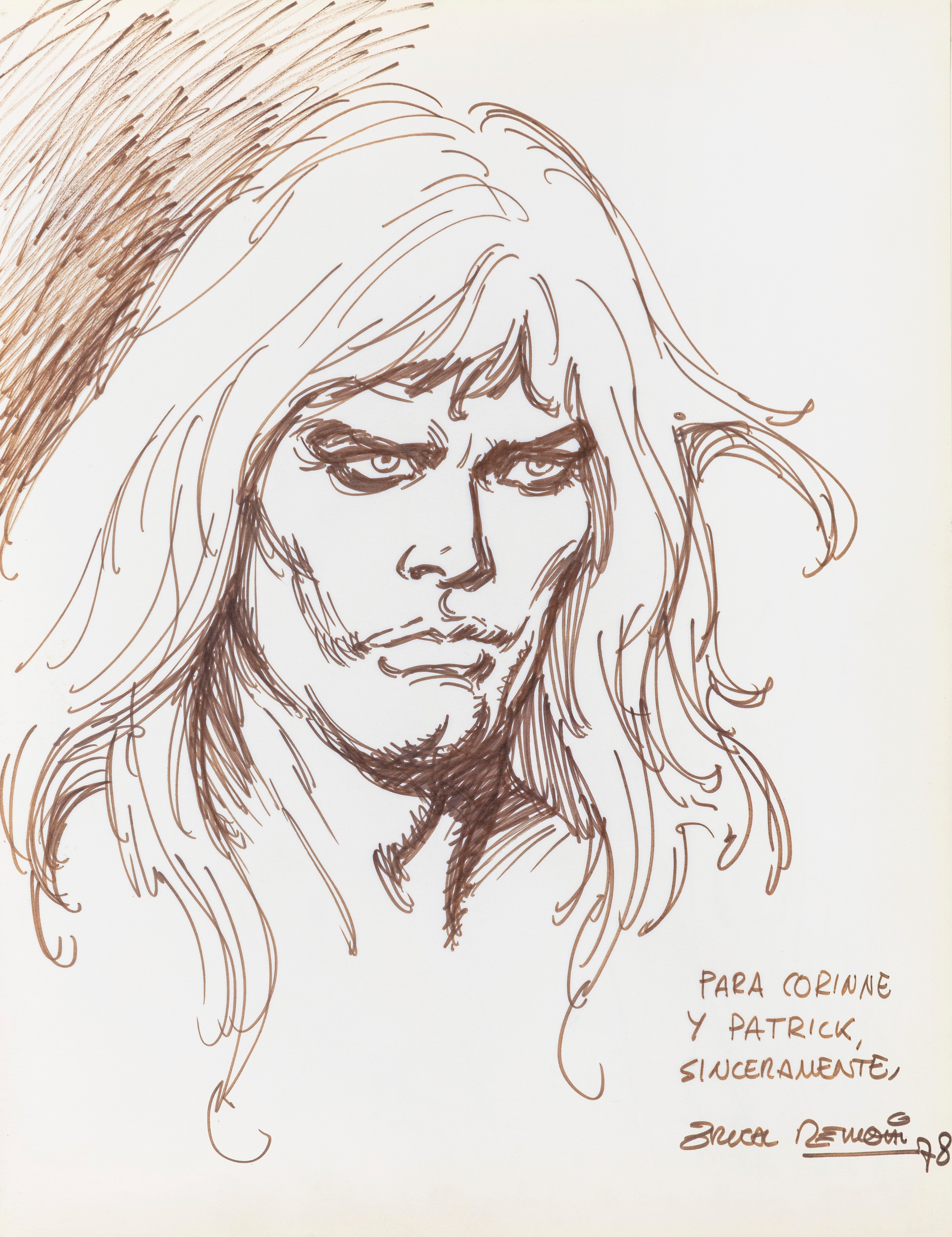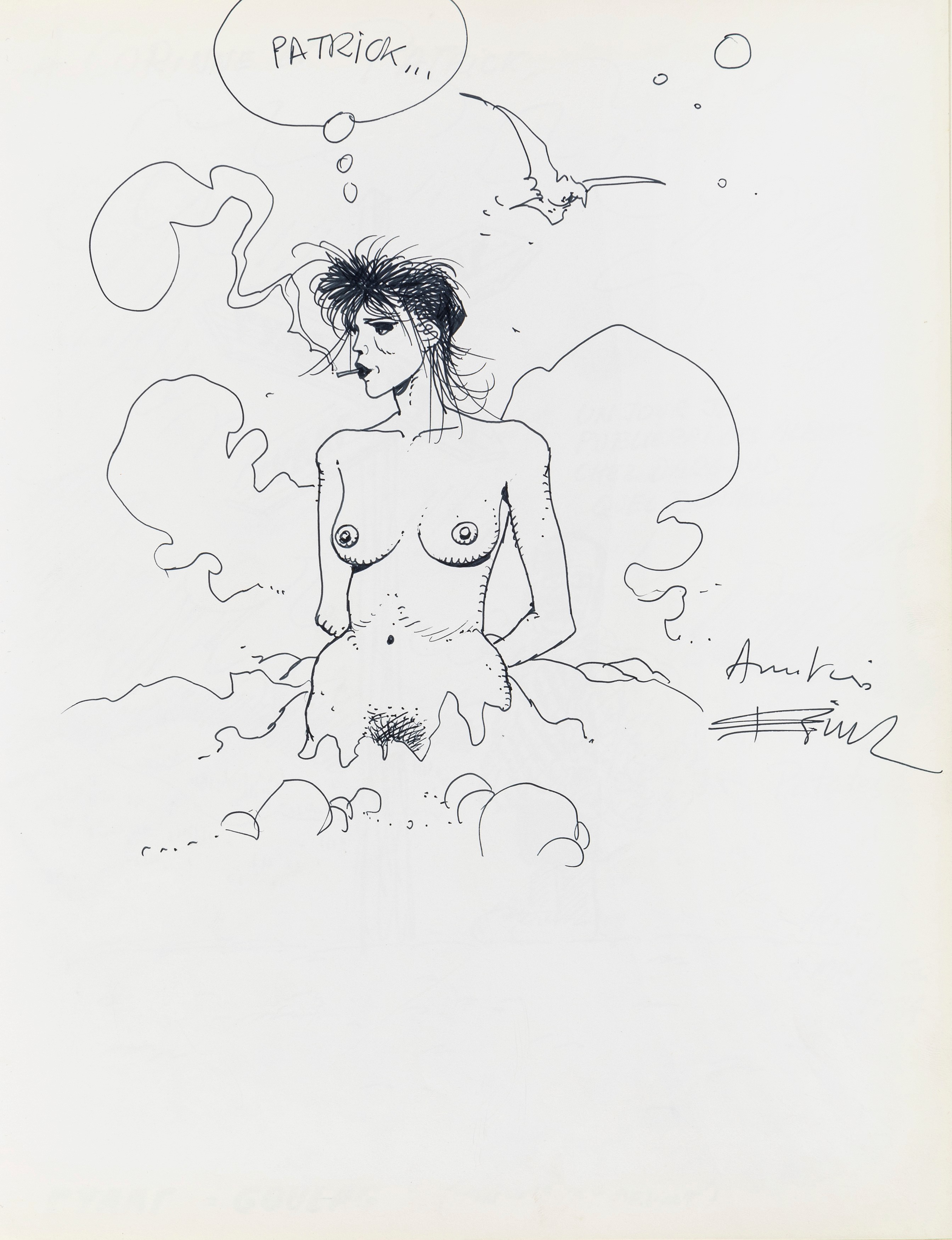 Lot of 35 original drawings contained in a "livre d'or" (guest book) that belonged to the famous French publisher Georges Dargaud and his daughter Corinne. All the drawings are dedicated to Corinne Dargaud and her husband Patrick Verdin and are dated between 1976 and 1988, bringing together the greatest names in European comics of those years. Among the many authors we find Hugo Pratt, Morris (Maurice de Bevere), Enki Bilal, Greg (Michel Regnier), Michel Blanc-Dumont, Dupa (Luc Dupanloup), Antonio Hernandez Palacios, Walter Fahrer, Mic Delinx (Michel Houdelinckx), Claude Marin, Jean-Claude Mézières, Dany (Daniel Henrotin), William Vance, Jean-Claude Forest, Julio Ribera, Robert Gigi, Fred (Frédé ric Othon), Gérard Lauzier, F'Murrr (Richard Peyzaret), Román Arámbula, Pierre-Léon Dupuis, Copi (Raúl Damonte Botana), Turk (Philippe Liégeois), Annie Goetzinger, Yves Bordes, Philippe Bertrand, Jean-Pierre Autheman, David Pascal, ecc... The book is hardback, bound in red cloth and in the second page there is the dry stamp of the Bibliothèque personnelle Georges Dargaud - Corinne Dargaud. Provenance: "Dessins" auction by Lasseron & Associés on 24 February 2006.