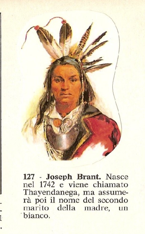 Original illustration made by De Gaspari and Tempesti for sticker no. 127 depicting the Indian chief Thayendanegea, published in the "West" album by Panini in 1976.