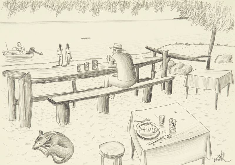 Lot composed of the preliminary pencil and the final watercolor of an illustration made by Loustal entitled "Polinesia", published in the book "Esprits d'Ailleurs" by the French publishing house La Table Ronde in 2014. << His sumptuous melancholic drawings are like dream postcards from his travels (...). In black and white or in those almost pastel colors that he loves, it is a permanent wonder. >> (Le Figaro) Signed.