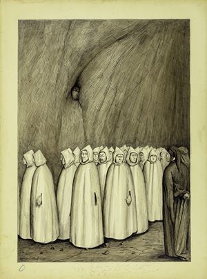 Original illustration made by Manfredini between 1904 and 1907 for his famous edition of "The Divine Comedy" published by Nerbini in 1908. Posting holes, slight creases, small losses and small tears in the margins. Signed. Born in Ferrara in 1881, Manfredini moved to Florence in 1904, the year in which the publisher Giuseppe Nerbini commissioned a new edition of the Comedy, asking him to illustrate the one hundred cantos of the poem. During the feverish and excited performance of this laborious work, Manfredini fell madly in love with the Ukrainian opera singer Solomija Krusel'nyc'ka; his unrequited love drove him to madness and to several violent episodes that resulted in numerous arrests. In April 1907 he was arrested after being found in possession of a pistol and a bottle of vitriol (probably intended for the Ukrainian soprano), he was then admitted to the Mombello mental asylum in Brianza where, after an agony lasting forty days, Manfredini officially died from a serious form of pulmonary tuberculosis. His work remained unfinished, stopping at the XXX canto of Purgatory, Nerbini then decided to entrust the remaining panels to the Neapolitan Tancredi Scarpelli.