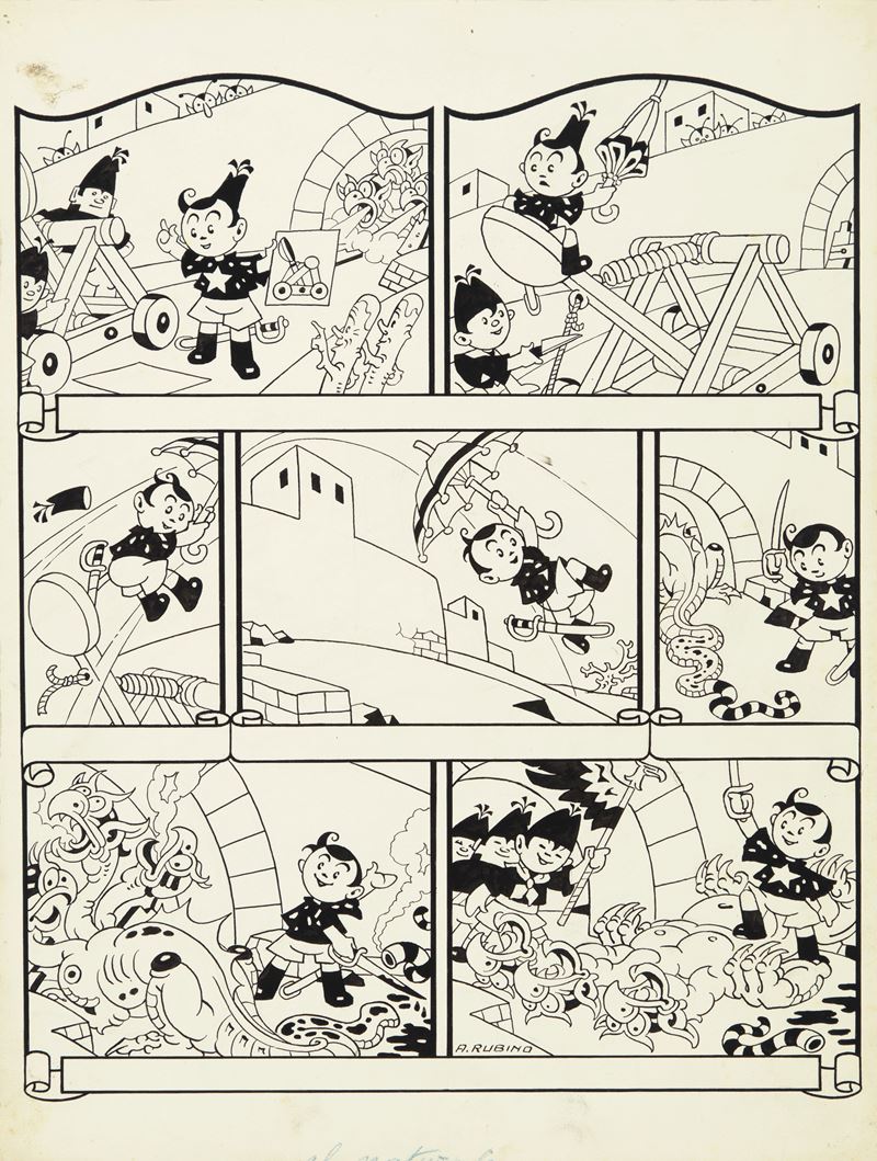Original comic art made by Rubino for an episode of his Lio Balilla, published on the front page of the newspaper Il Balilla between 1927 and 1929. After nineteen years at CdP, a key figure in the newspaper's editorial staff, Rubino decided to leave the Milanese newspaper to join the regime newspaper Il Balilla, driven by "an absolute need to carry out my work in a less apolitical field and in a more lively and combative manner." Rubino worked at Balilla for only three years, from 1927 to 1929, making comic strips from this period extremely rare. Pin holes in the top margin. Signed.