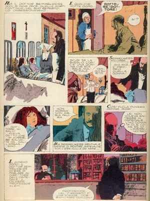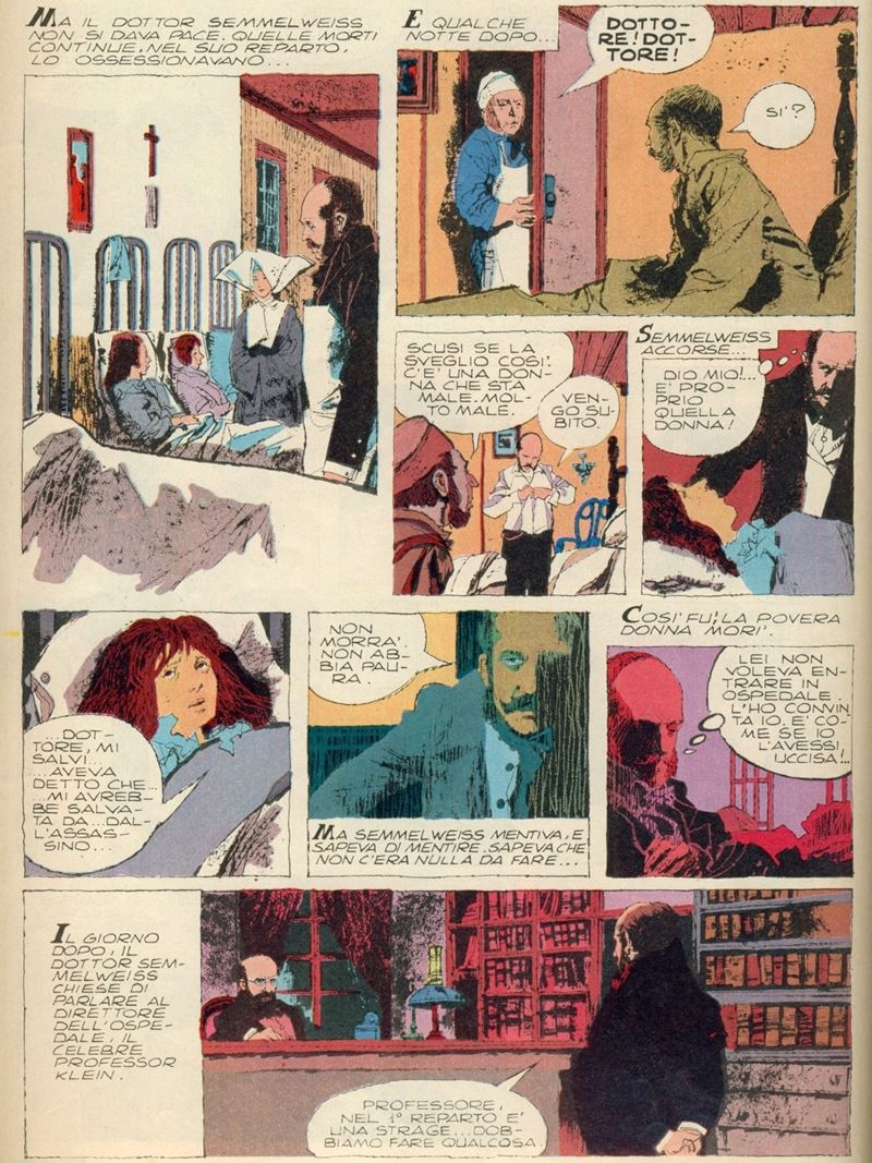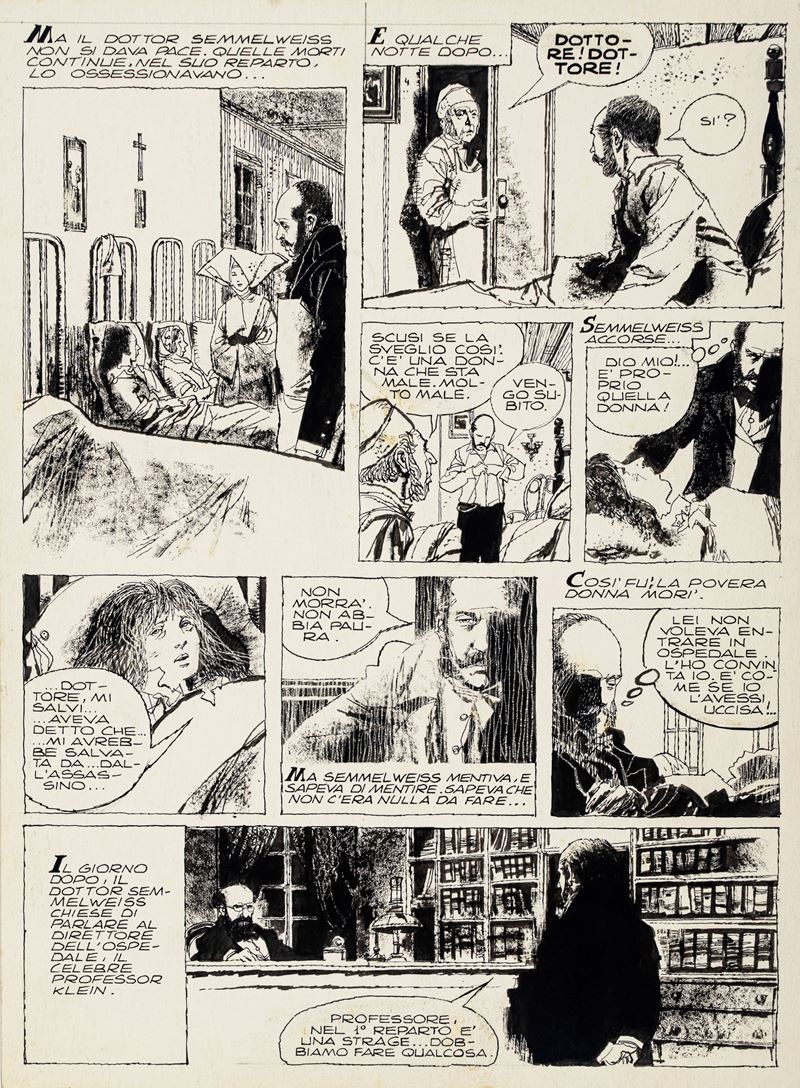 Original comic art made by Battaglia for "The Invisible Assassin," page 3 of this story, first published in volume form in "Uomini coraggiosi" by Fabbri Editori in 1980. This wonderful page showcases all of Battaglia's mastery, his unmistakable style: ink scratched with a meticulous razor blade and ink applied with an evanescent pad.