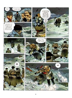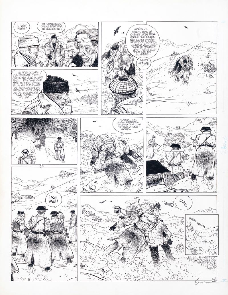 Original comic art made by Bilal for page 19 of "Les Phalanges de l'Ordre Noir," first published in Pilote n. 53 in 1978 and later reprinted in a volume by Dargaud in 1979. A French author, illustrator, and director born in Belgrade, winner of the Angouleme Grand Prix in 1987, Bilal and Pierre Christin created "Les Phalanges de l'Ordre Noir," a dense and violent geopolitical story inspired by the Spanish Civil War, unanimously recognized as their masterpiece. Small dent in the upper right corner. Publisher's stamp on the back. Signed.