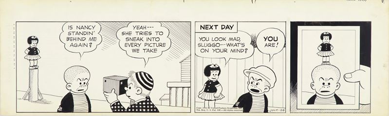 Daily comic strip from July 26, 1944, for "Nancy." Bushmiller created this amusing strip in 1938, focusing his imagination on the adventures of little Nancy, accompanied in this episode by her inseparable friend Sluggo Smith. Pinholes in the top margin. Signed and dated.
