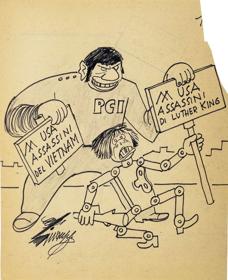 Original illustration made by Guareschi and published in the newspaper La Notte on April 11, 1968. << Now spin around a bit with this >>. Slight creases. Signed on the front and dated on the back.
