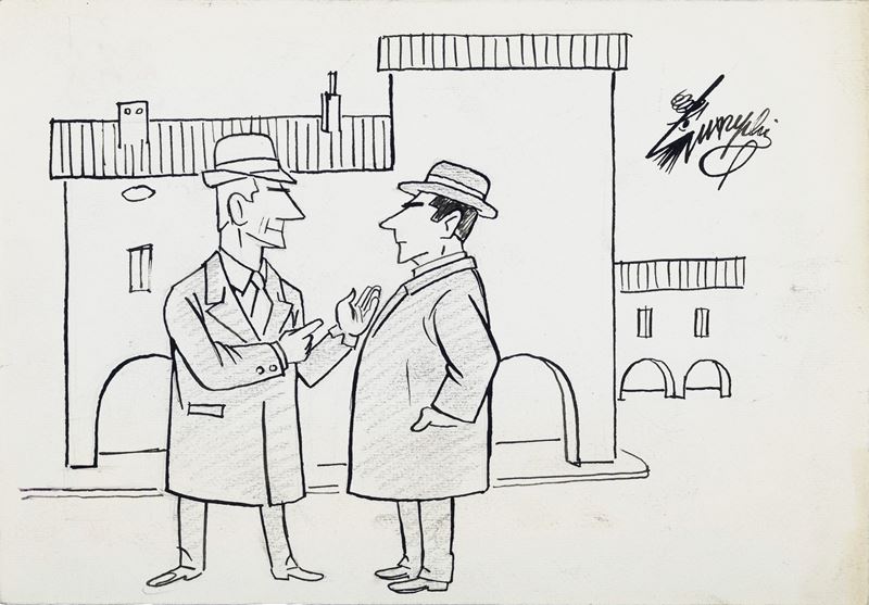 Original illustration made by Guareschi and published in the newspaper La Notte on November 5, 1964. << I am for Saragat: with a President of the Republic like him, the cause for the restoration of the monarchy would gain a lot. >> Signed on the front and dated on the back.