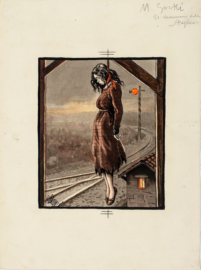 Original cover made by Toppi for the novel "The Station Drama" by M. Gorky, published in the Romanzo Popolare series by Nerbini in 1929. Pinholes in the margins. Signed.