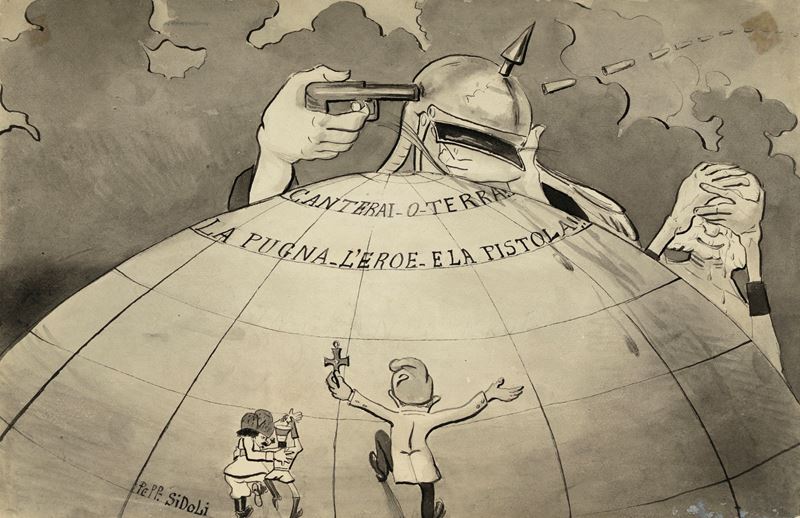 Original illustration made by Sidoli in the 1910s. Published in the catalog of the exhibition "Nazzareno and Giuseppe Sidoli," edited by Ferdinando Arisi and published by Piacenza Amici dell'Arte in 1980. Some signs of dampness. Signed.