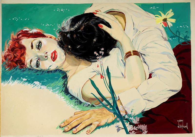 Original illustration made by Danish artist Norstrand, a staple of glossy fashion magazines from the 1950s and 1960s. Slight crease in the lower left corner. Signed.