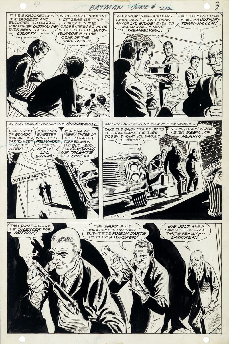 Original comic art made by Novick for "Baffling Deaths of the Crime-Czar!", published in Batman n. 212 on page 3 by DC in 1969. Batman and Robin in plainclothes ready to defeat a gang of dangerous gangsters.
