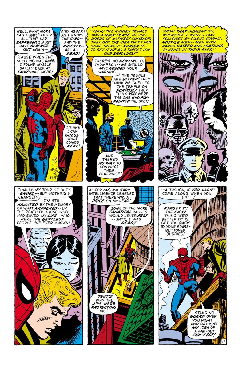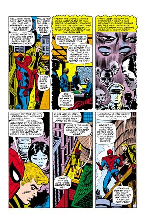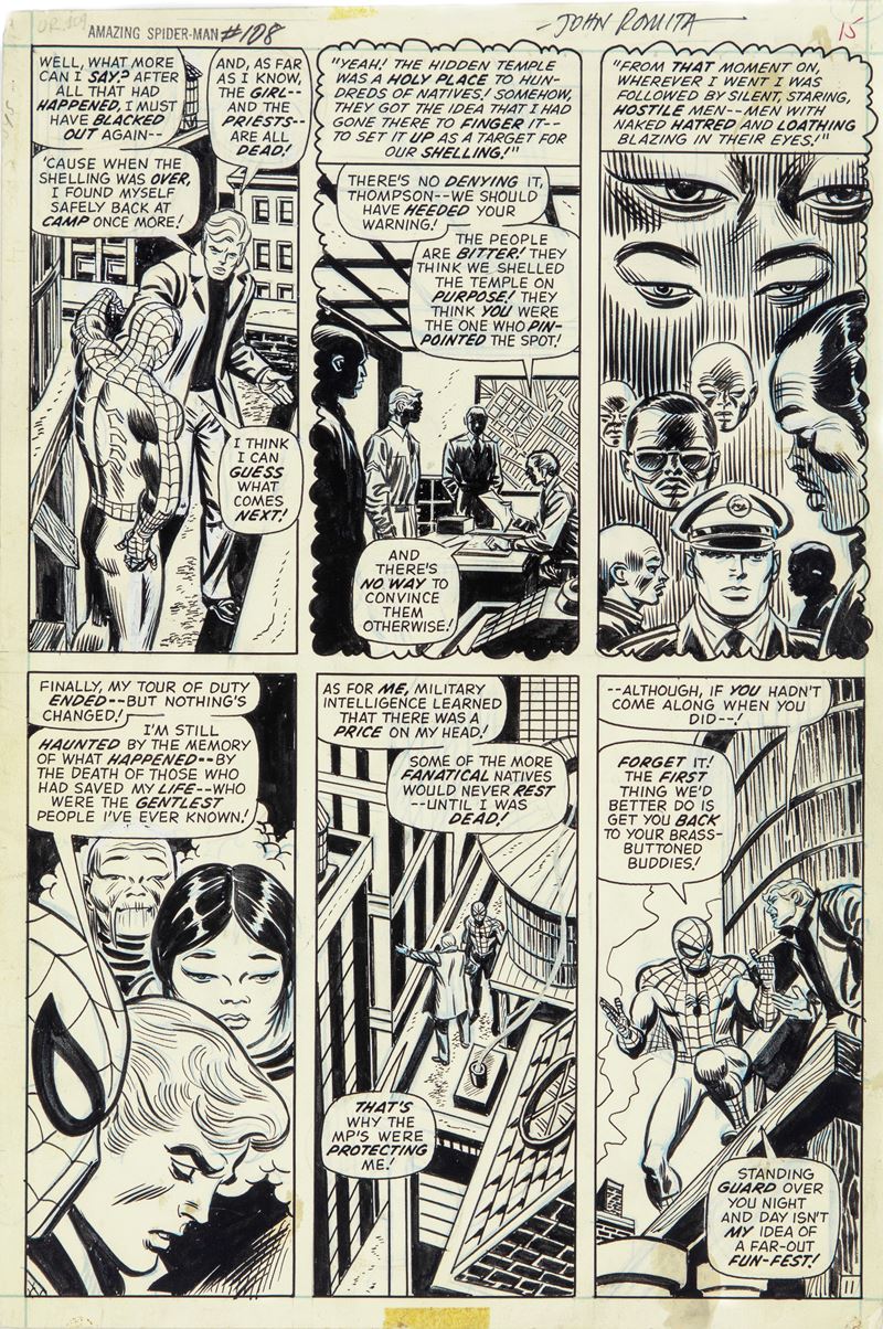Original comic art made by Romita Sr. for "Vengeance from Vietnam!", published in The Amazing Spider-Man n. 108 on page 11 by Marvel in 1972. On this page, we see Spidey having just saved former soldier Flash Thompson from an attack by the mysterious Monks of Light and the apparent kidnapping of army soldiers. Through his painful memories, Flash tells him that a few months earlier, while fighting in Vietnam, he was wounded in combat and stumbled upon the Sacred Hidden Temple. There, the peaceful monks healed Flash, and he quickly fell in love with the elder Sha-Shan's daughter. However, upon returning to his unit, he learned that the military was planning to bomb the sector where the temple was located. Horrified, Flash went to warn them, but was unable to convince them to abandon their home, and they apparently became victims of the airstrike, with their temple destroyed. Flash would eventually be blamed for the bombing and followed by strange men. Concluding his story, Flash explains that this is why he's under military protection. The Amazing Spider-Man n. 108 is considered by American comics historians to be a key issue in Romita Sr.'s entire career, and Romita himself has never hidden the fact that issues n. 108 and n. 109 are among his most beloved works. In a June 2017 interview with SyFy Wire, Romita named The Amazing Spider-Man n. 108 and n. 109 as the two stories he was most proud of, explaining that when he created those issues, he was no longer drawing inspiration from Steve Ditko, but was establishing his own style as an artist. Romita emphasized the Milton Caniff-inspired brushwork he used in those pages, regretting that he no longer owns the originals. There are very few pages in which Romita Sr. had the opportunity (editorial deadlines were extremely tight) to fully express himself as an artist, being able to personally ink the pages he created. This is one of the very few pages ever to appear on the market in which pencils and inks are by Romita Sr. In what could be his testament as a complete cartoonist, Romita Sr. gives us a care in the faces, in the details, in the shadows that certainly draw on the teachings of Caniff, but which elevate him to the greatest superhero author of all time. << (...) There are two issues that I've told people are my favorite Spider-Man: issue 108 and issue 109. It was a storyline I had a lot to do with. And the reason I drew it, and I insinuated the ideas to Stan, was because it was an opportunity to do oriental scenes in the style of Caniff. That was the Vietnam sequence where Flash Thompson returns from Vietnam, and someone from Southeast Asia wants to kill him because he destroyed a temple. Spider-Man saves his life, and Dr. Strange was a guest star. These two stories are the ones I'm most proud of, artistically speaking. They're more like me than anything else. The storytelling, the art, the powers, and the fact that I used a lot of black. It was juicy, what I call juicy artwork. >> Interview with John Romita by Tom Spurgeon – The Comics Journal (https://www.tcj.com/an-interview-with-john-romita-by-tom-spurgeon/). Slight creases at the corners, small abrasion at the top margin. Signed.