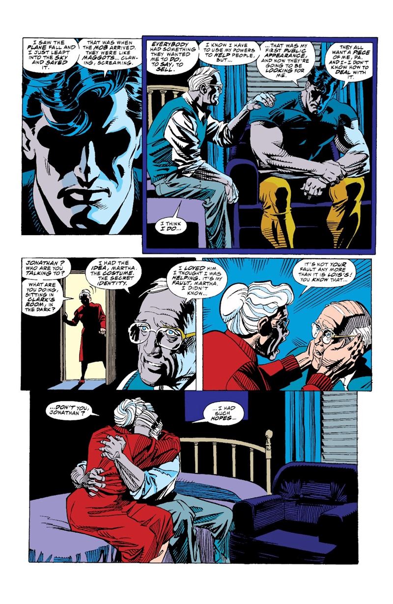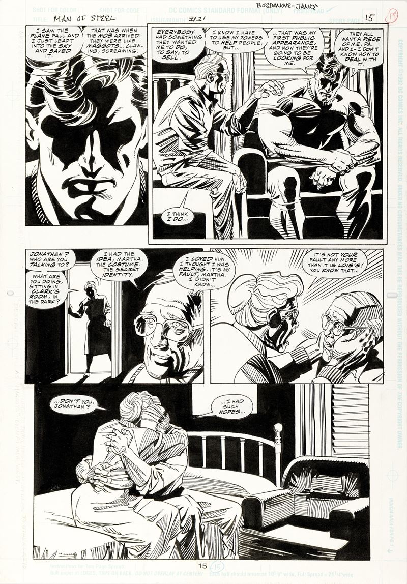 Original comic art made by Bogdanove for "Ghosts," published in Superman: The Man of Steel n. 21 on page 15 by DC in 1993. Jonathan Kent appears to be having a heart-to-heart conversation with his son Clark, aka Superman, in Clark's childhood bedroom on the family farm in Smallville. But when Martha Kent opens the door, the heartbreaking truth is revealed: Clark died (in the previous issue) at the hands of Doomsday, and Jonathan has been speaking to an empty room, burdened by guilt for always encouraging his son to become a hero.