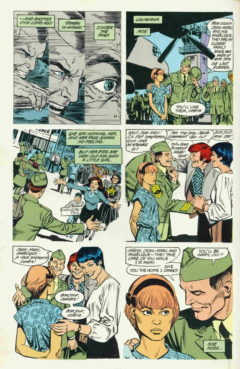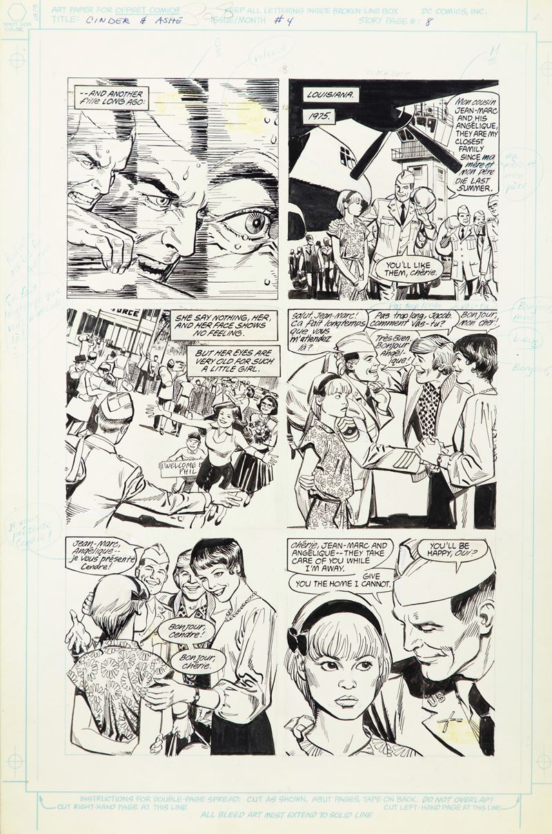 Original comic art made by García-López for the miniseries "Cinder and Ashe" n. 4, published on page 8 by DC in 1988. The story follows the two partners of a private investigation firm; Jacob Ashe is a Vietnam War veteran, while Cinder DuBois is the daughter of an African-American soldier and a Vietnamese woman. Cinder and Ashe are hired by an Iowa farmer to find his kidnapped daughter. During the investigation, flashbacks reveal how Cinder and Ashe met and how their relationship developed.