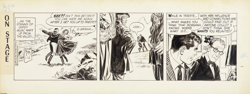 Daily comic strip from January 22, 1965, for "On Stage." Starr's script blends soap opera, adventure, and humor, while the work is characterized by a studied line and often innovative storytelling. The strip offers behind-the-scenes drama on Broadway, following the career of actress Mary Perkins in New York, Hollywood, and on various international film sets and locations. Signed and dated.