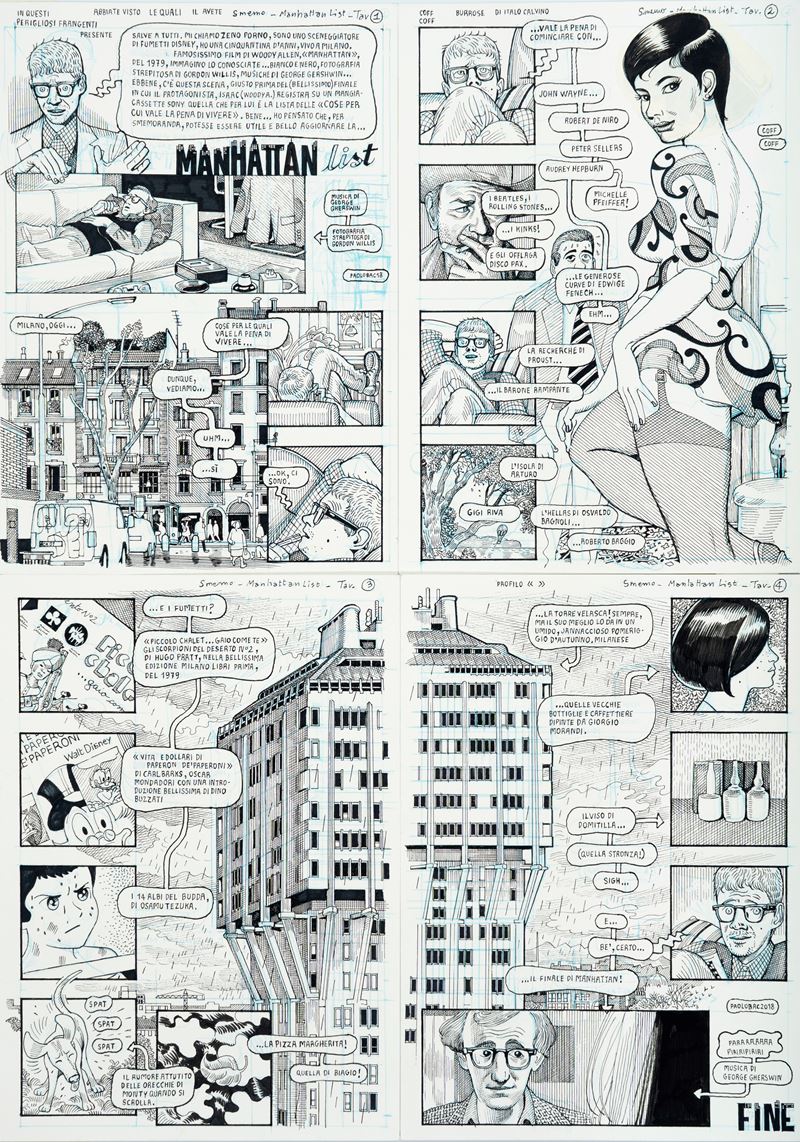 Complete story composed of 4 original comic arts by Bacilieri for "Manhattan List," published in the 2019 Smemoranda diary. A touching and brilliant tribute by Bacilieri to Woody Allen's film "Manhattan," to his hometown of Milan, and...to all the things worth living for. Signed and dated.