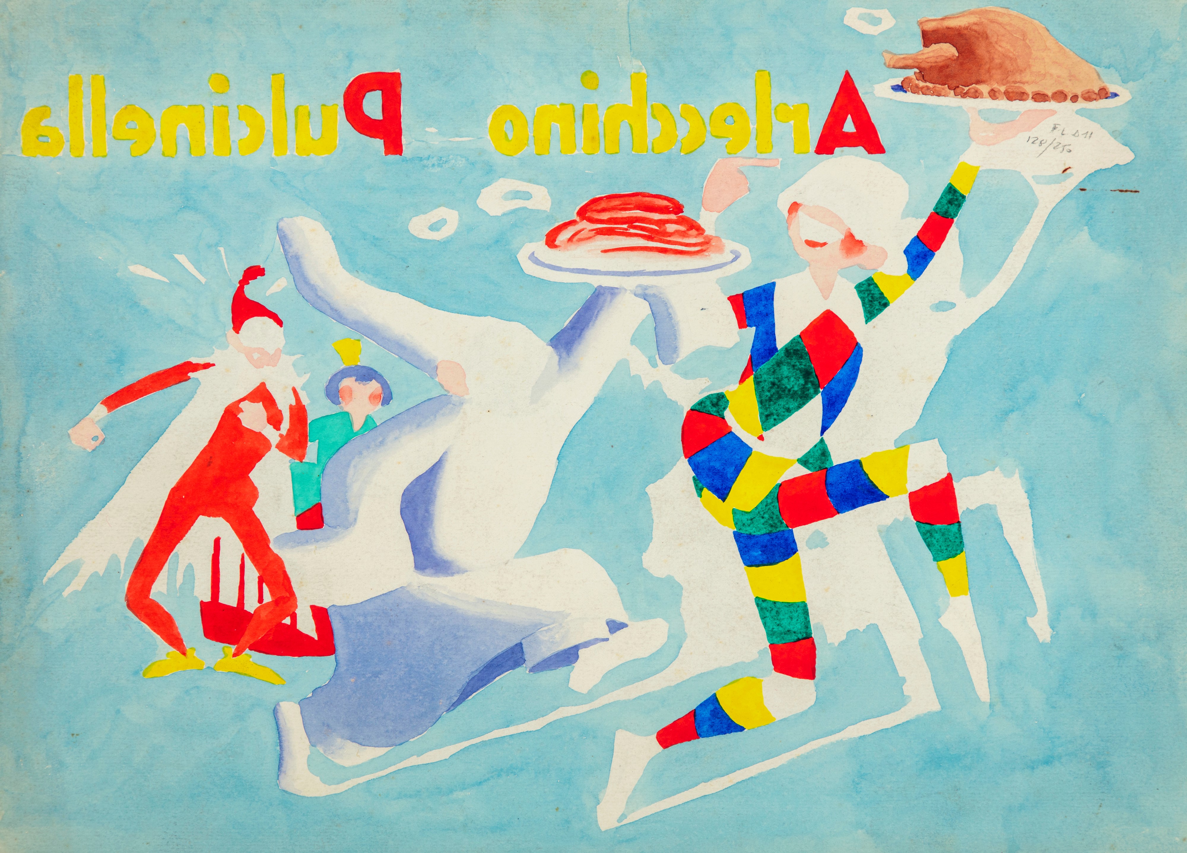 Original cover made by Verdini for "The Adventures of Harlequin and Pulcinella," published in the children's magazine Pioniere, edited by Gianni Rodari in the early 1950s. Watercolored on the back. Signed.