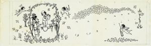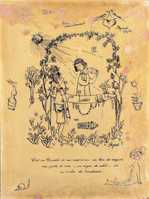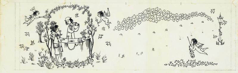 Original drawing made by Peynet in 1968, depicting his famous "Lover", the most reproduced pair of young lovers in the world. A copperplate reproduction of this work is in the collection of the Piccolo Museo del Fumetto in Bibbiena. Vertical crease in the center and a small tear in the top margin.