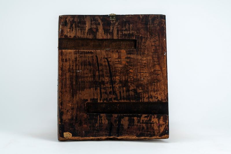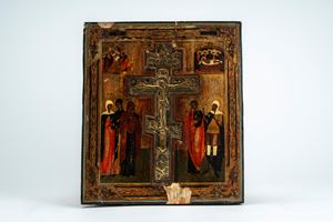 Четыре иконы на доске: стауротека, Казанская Богоматерь, четверочастная икона Богородицы и икона с явлением Богоматери святому апостолу Петру и святой Параскеве, Россия, конец XIX века